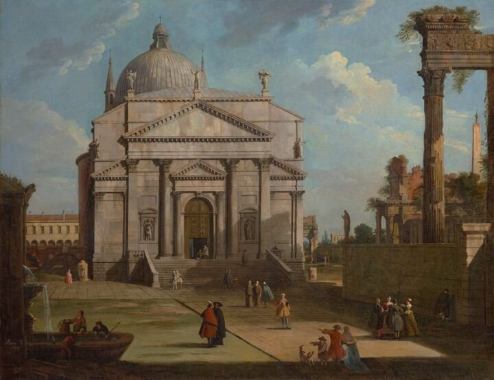 Capricho arquitectónico con figuras elegantemente vestidas y un perro a la entrada de un palacio