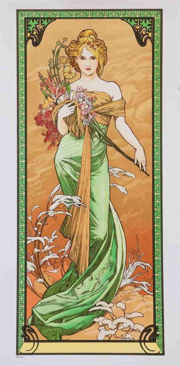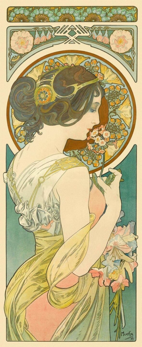 Alphonse Mucha (1860–1939) fue una de las figuras centrales del Art Nouveau y uno de los primeros artistas en borrar los límites entre arte, diseño y comunicación visual. Nacido en Moravia (hoy República Checa), alcanzó la fama en París a fines del siglo XIX gracias a sus afiches para el teatro, especialmente los creados para la actriz Sarah Bernhardt. Su estilo —líneas sinuosas, motivos florales, figuras femeninas idealizadas y una paleta armoniosa— no solo definió una época, sino que impuso una nueva sensibilidad visual que influenció desde la publicidad hasta las artes aplicadas.