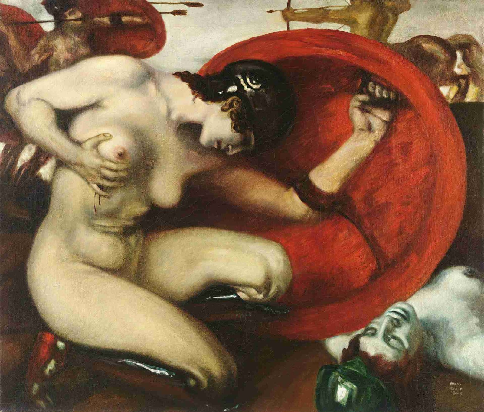 Esta pintura, realizada en 1905, destaca por su representación magistral de una figura femenina en el papel de una amazona herida en combate. La elección del tema mitológico de la amazona, una guerrera de la antigua Grecia, refleja el interés de von Stuck por la mitología clásica y su capacidad para fusionar elementos simbolistas con un estilo artístico distintivo.