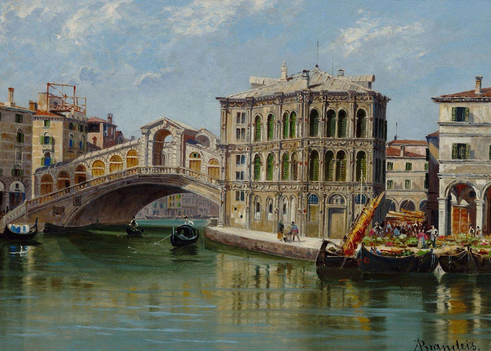 Antonietta Brandeis (1848-1926) fue una pintora checa-italiana conocida por sus exquisitas vistas arquitectónicas y paisajes urbanos, especialmente de Venecia. Su obra pertenece al movimiento del vedutismo, un estilo que busca retratar paisajes urbanos con gran precisión y detalle. Brandeis sobresalió por su capacidad para capturar la atmósfera y el encanto de las ciudades italianas, combinando un profundo conocimiento arquitectónico con una sensibilidad artística que resalta los matices de la luz y el color. Sus pinturas, pequeñas en escala pero grandes en impacto, reflejan la riqueza cultural e histórica de lugares icónicos como la Plaza de San Marcos y el Gran Canal.