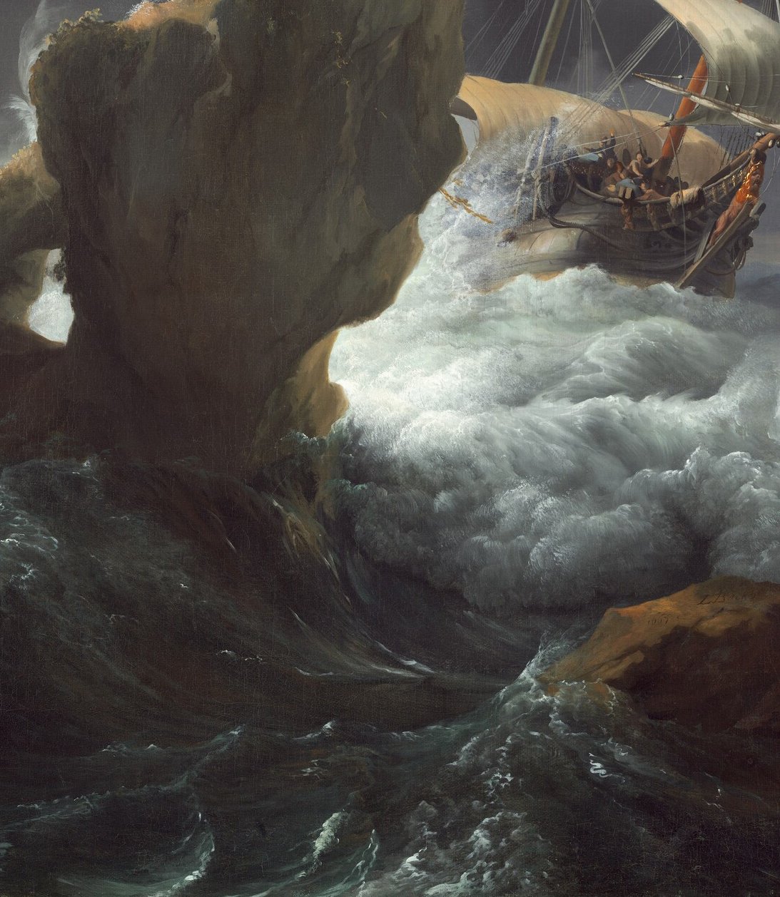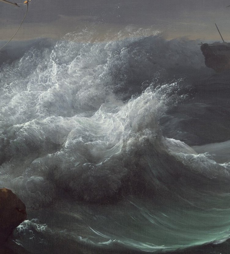 Más que una escena de naufragio, esta pintura de Backhuysen es una coreografía del abismo. Los barcos —minúsculos ante la furia del mar— no solo enfrentan una tormenta meteorológica, sino también una tempestad metafísica. La costa rocosa no ofrece refugio, solo una promesa de ruina inminente. El cielo, trabajado con pinceladas densas y sutiles transiciones cromáticas, no actúa como telón de fondo sino como protagonista: es un firmamento que se pliega y se tensa con la misma violencia que las olas. Cada mástil quebrado y vela desgarrada está resuelto con una precisión casi escultórica, pero lo que conmueve no es el detalle técnico sino la sensación de tragedia inminente que impregna toda la escena.