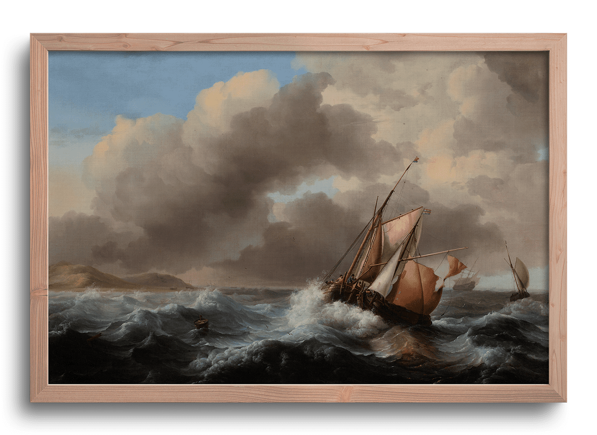 Una pequeña flota de embarcaciones lucha contra las olas bajo un cielo amenazante que anuncia tormenta. Las velas se tensan por el viento y la espuma del agua estalla contra los cascos, mientras la luz se filtra entre nubes densas con un dramatismo casi teatral. La escena no es solo una representación del oficio marítimo, sino también una meditación sobre la fragilidad humana frente a las fuerzas naturales. Backhuysen logra capturar tanto el movimiento del mar como la tensión emocional del momento, convirtiendo la navegación en un acto épico.