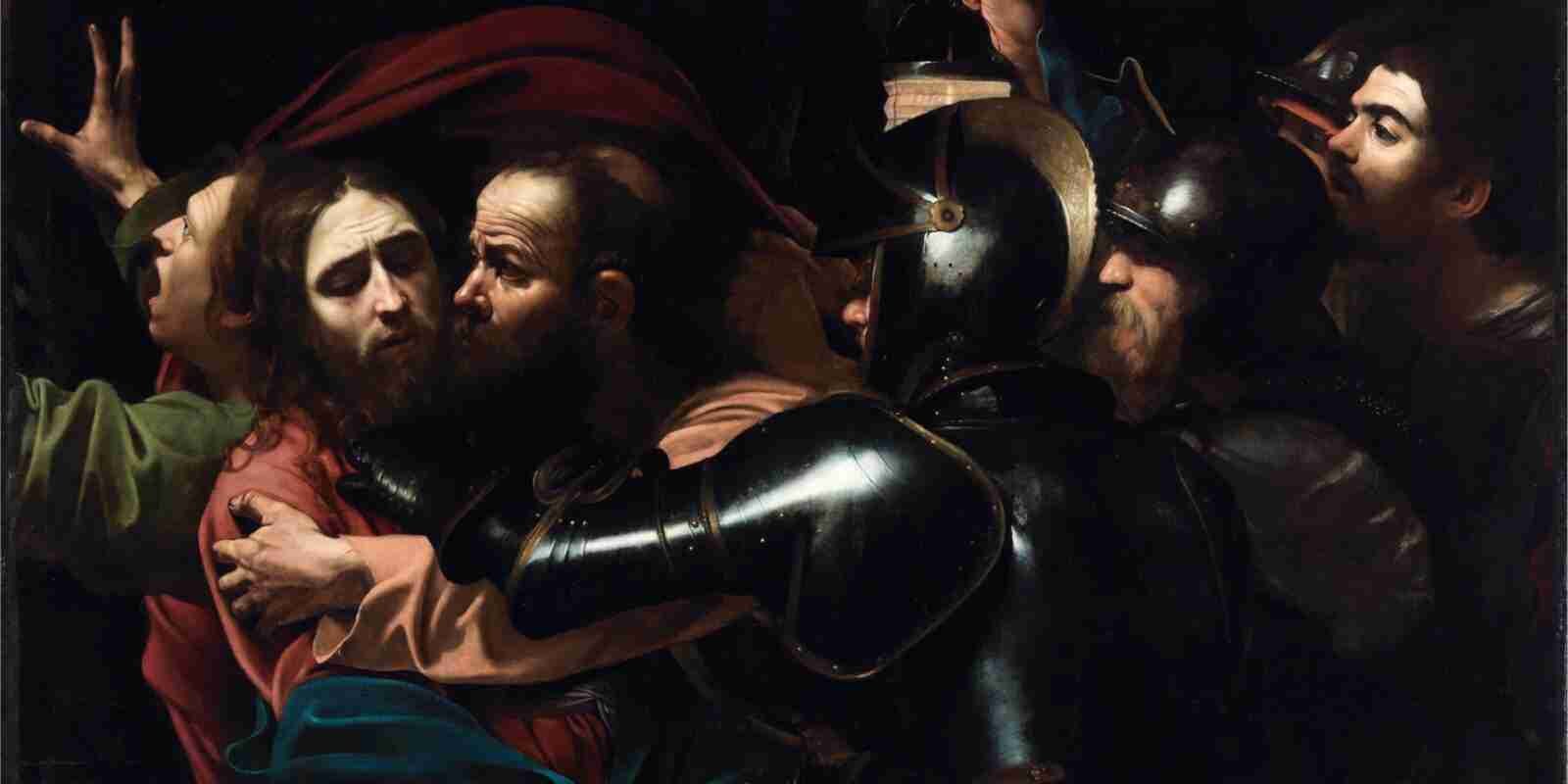 La captura de Cristo (1602),»Este cuadro representa el arresto de Cristo en el huerto de Getsemaní. La escena está llena de tensión y dramatismo, con el uso característico de Caravaggio del claroscuro para destacar las emociones de los personajes, especialmente el beso de Judas y la reacción de Cristo.»