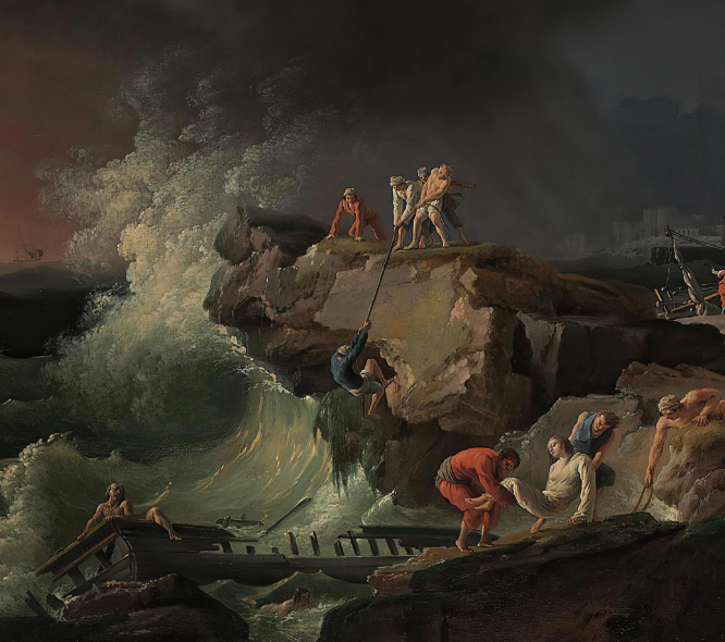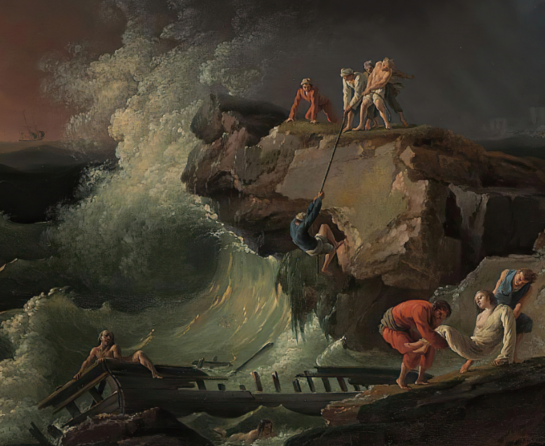 «Un naufragio con figuras llegando a la orilla» es un testimonio del virtuosismo de Vernet en la representación de la interacción entre el ser humano y la naturaleza indomable. En esta obra, la tragedia y la esperanza conviven en una escena de caos y supervivencia, donde el mar embravecido golpea la costa mientras figuras desesperadas luchan por alcanzar la seguridad de la arena. Vernet no solo pinta el momento del desastre, sino que lo llena de emoción y tensión, guiando la mirada del espectador a través de las diagonales de las olas, la penumbra tormentosa y los gestos teatrales de los náufragos. Su minucioso trabajo con la luz dota la escena de un realismo vibrante, con reflejos en el agua y sombras en las rocas que aumentan la sensación de profundidad y movimiento. Esta obra no solo es una pieza de maestría técnica, sino también un reflejo del espíritu ilustrado de la época, donde el poder de la naturaleza y la fragilidad humana se presentan como un drama eterno.