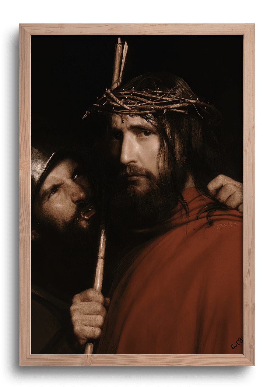 Carl Heinrich Bloch (1834–1890), formado en la Real Academia Danesa y profundamente influenciado por su estancia en Italia, supo combinar la herencia de los grandes maestros barrocos —especialmente Rembrandt y Caravaggio— con un lenguaje pictórico accesible al público de su tiempo. Su pintura no busca impresionar con milagros ni gestos divinos exagerados, sino conmover desde lo humano: la carne herida, la mirada serena, el silencio que habla. En Cristo con soldado burlón, el dramatismo está en el contraste moral, no en el movimiento: la brutalidad cotidiana del imperio frente a la quietud de lo sagrado. En su época, Bloch fue considerado uno de los renovadores del arte cristiano, y sus obras circulan hasta hoy como imágenes devocionales cargadas de fuerza narrativa y espiritual.