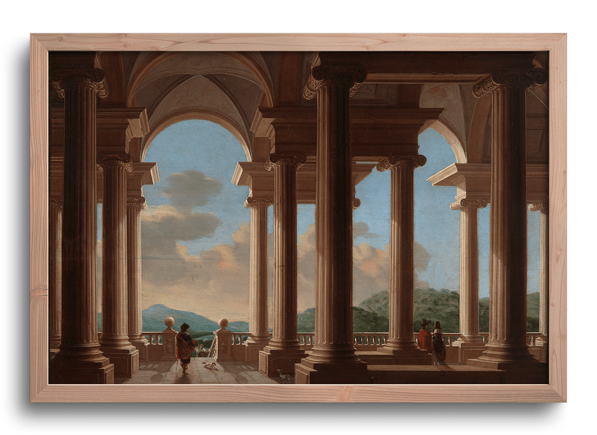 Daniel de Blieck fue un pintor neerlandés especializado en vistas arquitectónicas durante el siglo XVII, pero esta imagen pertenece a un linaje posterior de estudios arquitectónicos imaginarios que retoman su influencia. Estas construcciones no existen: son fantasías ordenadas según reglas clásicas, hechas para transmitir una idea de civilización y equilibrio. Durante el siglo XIX, este tipo de escena resurgió como ejercicio académico y como símbolo del poder del arte para proyectar mundos ideales. En esta versión, la arquitectura no representa un lugar concreto, sino un anhelo de claridad y estructura frente al caos exterior.