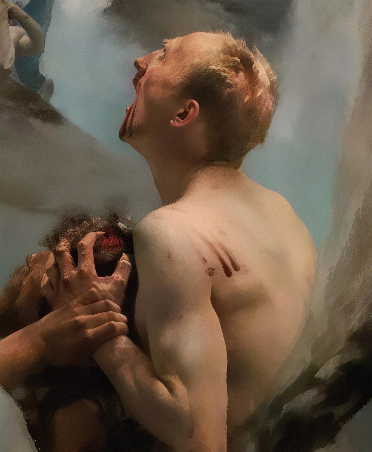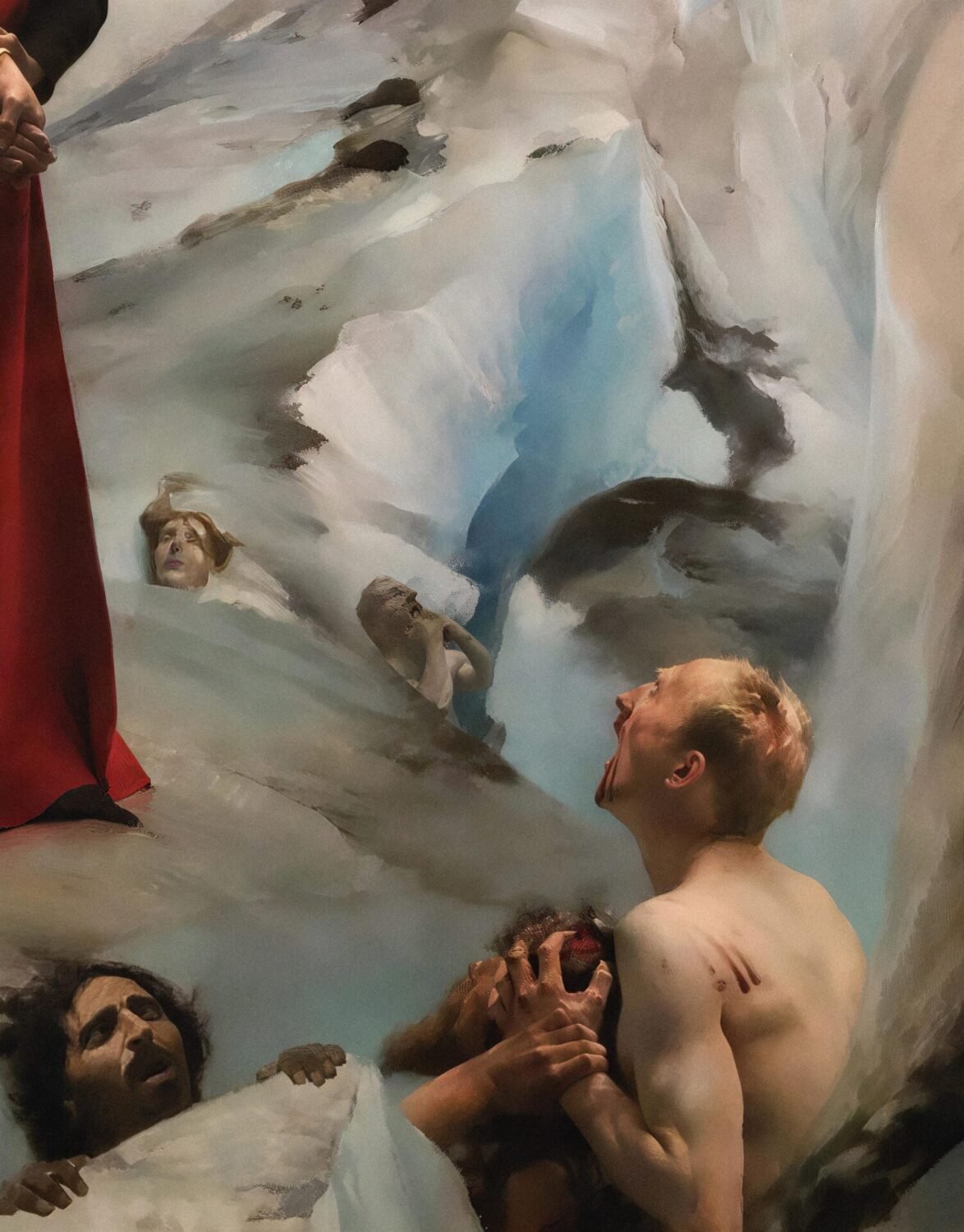 Courtois construye la escena desde una lógica plenamente material y corporal. El infierno no aparece como un espacio fantástico o demoníaco, sino como un paisaje físico, casi mineral, donde los cuerpos humanos —desnudos, tensos, pesados— se confunden con la tierra y el hielo. La violencia no es un acto puntual, sino una condición: las almas están condenadas a habitar un mundo donde el dolor es constante y no tiene desenlace. Desde la tradición académica francesa, Courtois utiliza su dominio del dibujo y de la anatomía para hacer creíble ese sufrimiento, evitando alegorías abstractas. Dante y Virgilio funcionan como eje narrativo y moral: uno representa al hombre que aún aprende y teme; el otro, a la razón que comprende el castigo pero no lo suaviza. La obra propone así una visión del infierno como experiencia tangible, donde la justicia no consuela y la verdad se manifiesta en la carne.