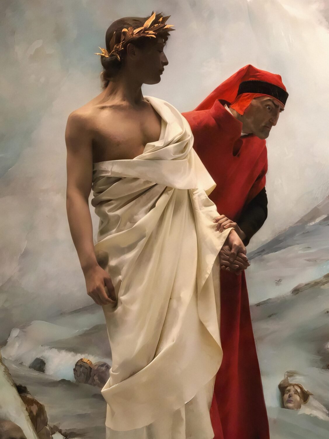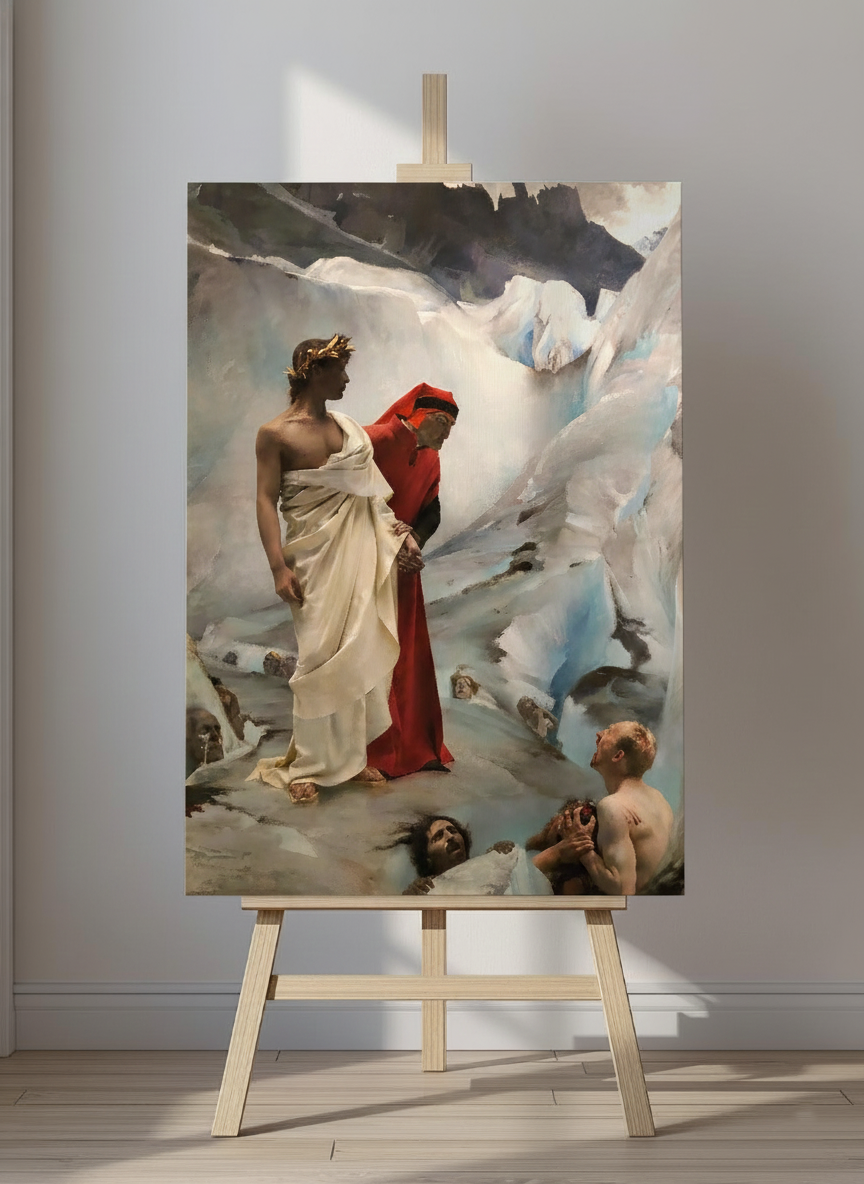La pintura representa un episodio del Infierno de la Divina Comedia, donde Dante Alighieri —poeta florentino del siglo XIV— desciende al reino de los condenados guiado por Virgilio, poeta latino y símbolo de la razón humana. Ambos atraviesan una zona del infierno donde las almas castigadas emergen del terreno helado y rocoso, atrapadas en un estado de sufrimiento perpetuo. No se trata de una escena de combate organizado ni de violencia heroica, sino de cuerpos sometidos al castigo: algunos se aferran unos a otros, otros intentan incorporarse desde el suelo, otros miran con desesperación a los vivos que pasan. Dante observa con angustia y conmoción, aún vulnerable frente al horror; Virgilio, en cambio, avanza con serenidad grave, consciente de que ese sufrimiento es parte del orden moral que rige el viaje.