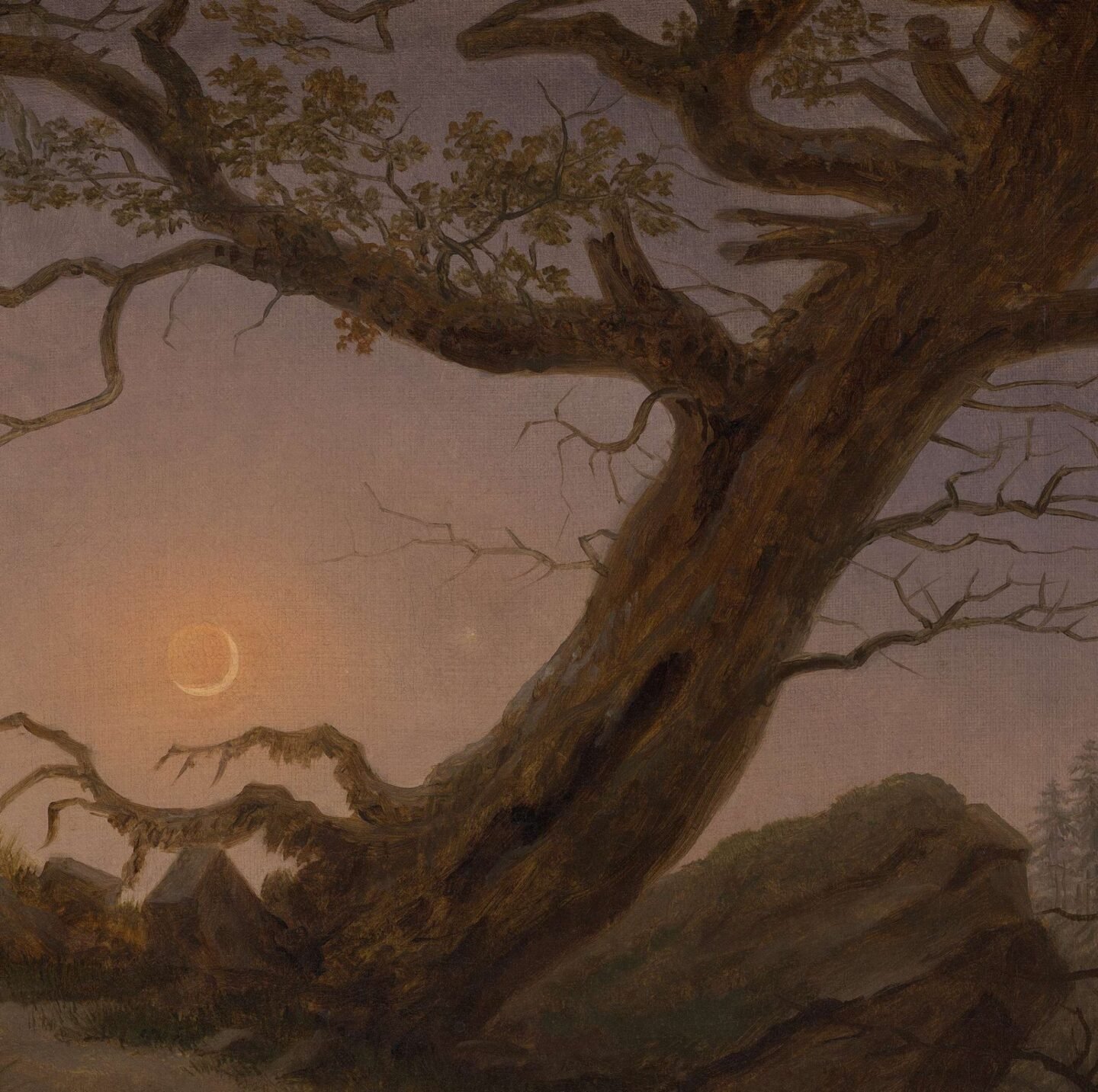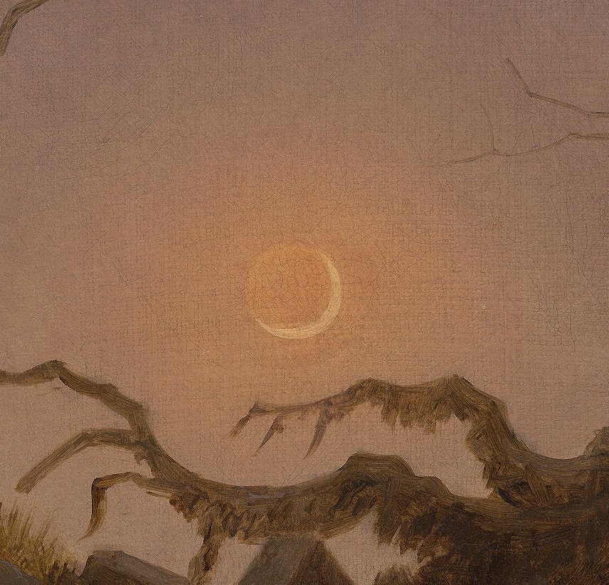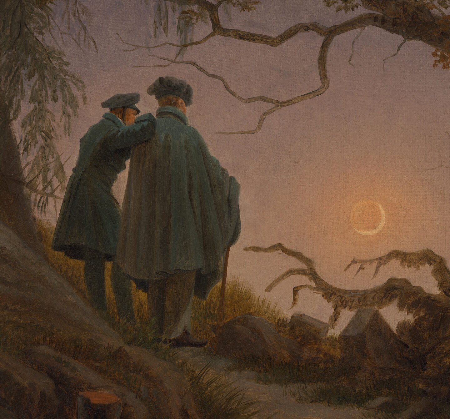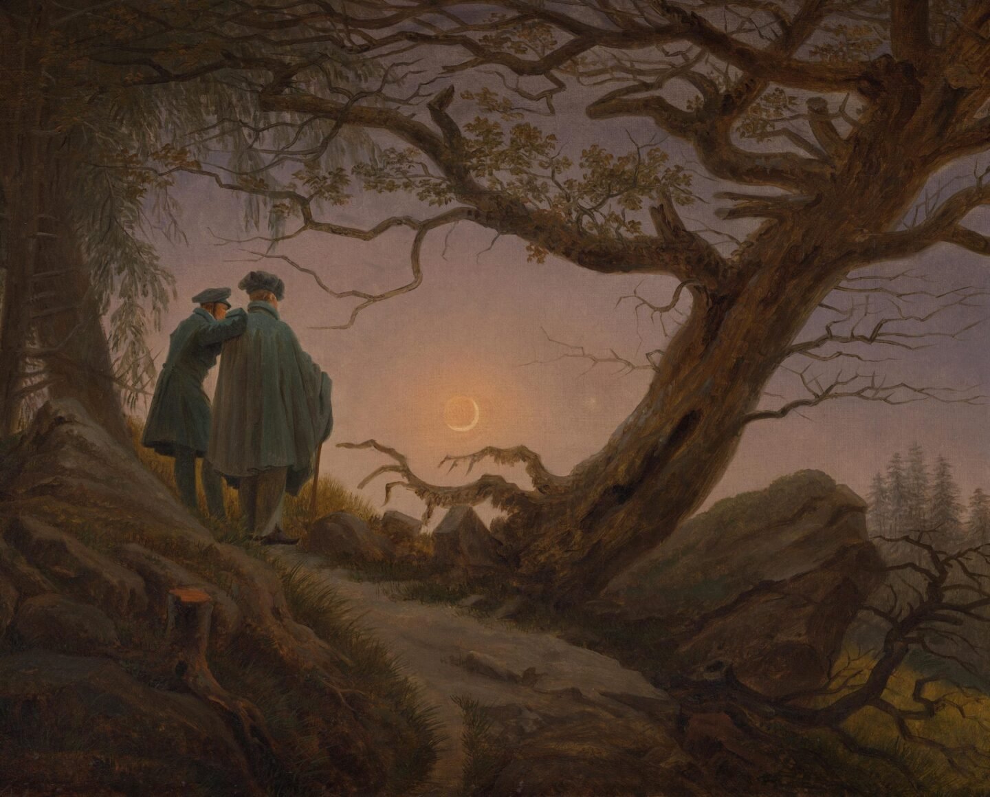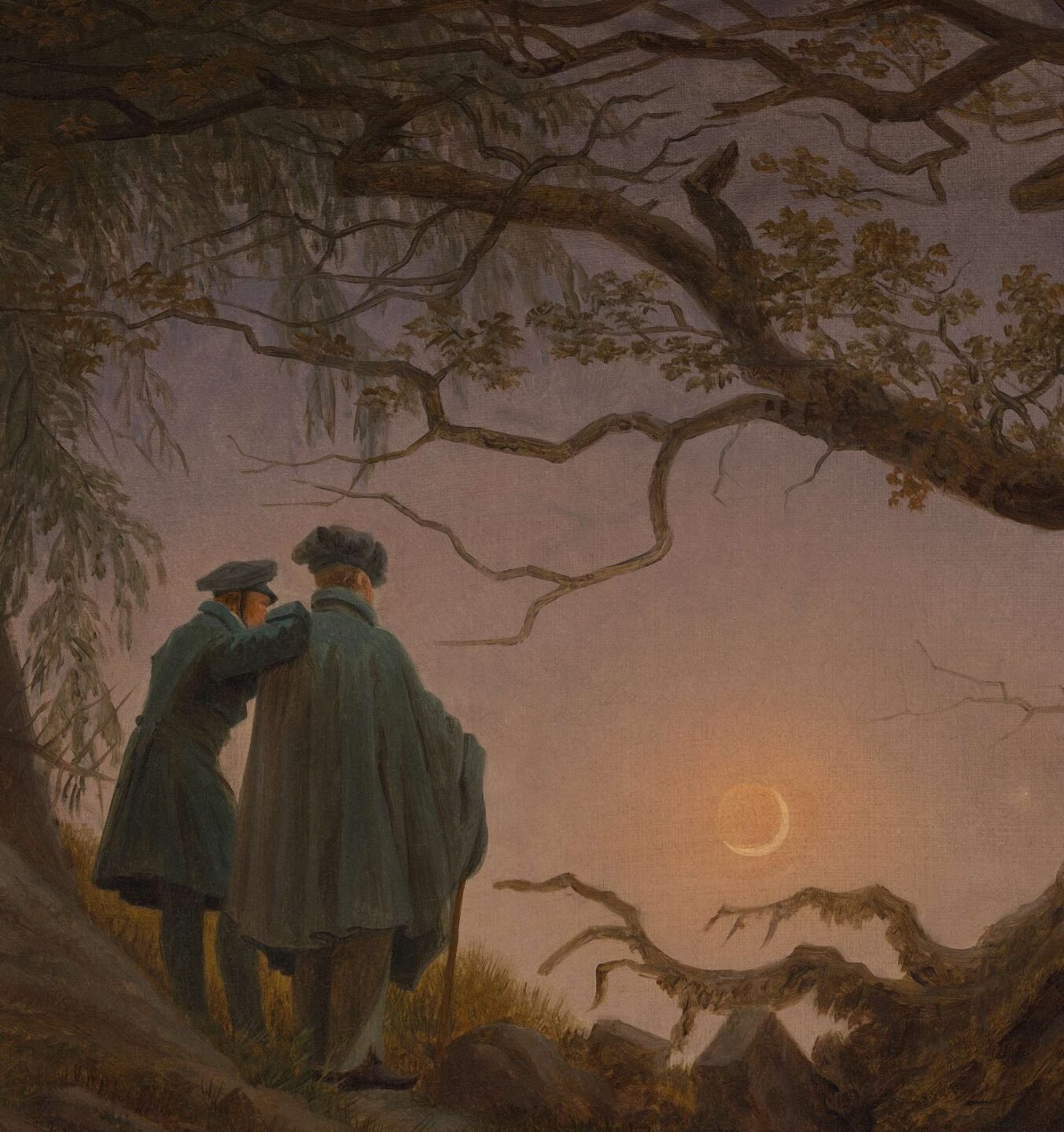Esta obra es más que una representación visual; es una meditación sobre la fugacidad de la vida y la búsqueda de trascendencia. La luna, como símbolo de lo eterno, invita al espectador a reflexionar sobre su lugar en el universo, mientras los dos hombres parecen compartir un momento de serena introspección. La atmósfera silenciosa y mística que envuelve la escena convierte a esta pintura en un hito del romanticismo, destacando la capacidad de Friedrich para plasmar emociones profundas a través de la naturaleza.