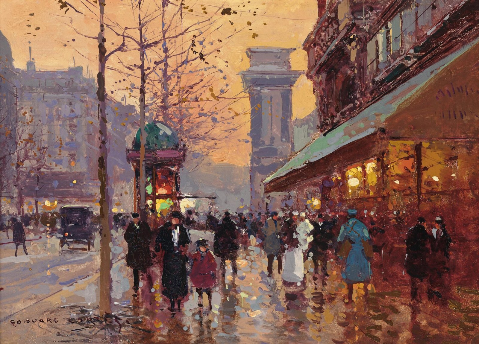 Édouard Léon Cortès fue un pintor francés célebre por sus escenas urbanas de París en las primeras décadas del siglo XX. Su obra se concentra en la vida cotidiana de la ciudad —calles mojadas por la lluvia, faroles encendidos al atardecer, carruajes, transeúntes y nieve invernal— captando una atmósfera vibrante y melancólica a la vez. Cortès combinó una observación precisa del espacio urbano con una pincelada suelta y luminosa, heredera del postimpresionismo, pero orientada menos a la experimentación formal que a la construcción de una memoria visual de París. Sus pinturas funcionan como crónicas sensibles de una ciudad en transición, donde la modernidad convive con una nostalgia persistente por el ritmo humano de la calle.