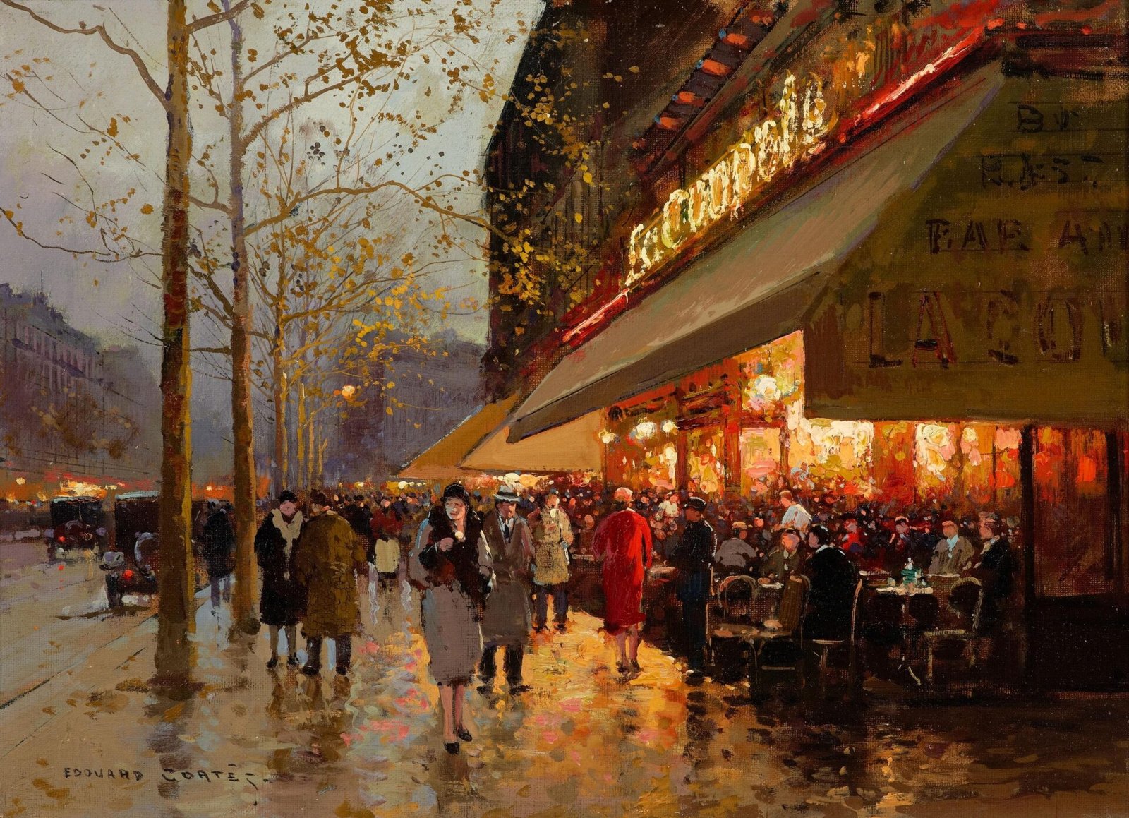 Édouard Léon Cortès fue un pintor francés célebre por sus escenas urbanas de París en las primeras décadas del siglo XX. Su obra se concentra en la vida cotidiana de la ciudad —calles mojadas por la lluvia, faroles encendidos al atardecer, carruajes, transeúntes y nieve invernal— captando una atmósfera vibrante y melancólica a la vez. Cortès combinó una observación precisa del espacio urbano con una pincelada suelta y luminosa, heredera del postimpresionismo, pero orientada menos a la experimentación formal que a la construcción de una memoria visual de París. Sus pinturas funcionan como crónicas sensibles de una ciudad en transición, donde la modernidad convive con una nostalgia persistente por el ritmo humano de la calle.