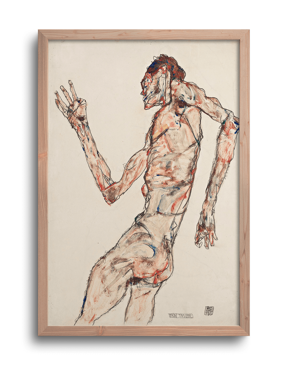 El cuerpo aparece en tensión, torcido, expresivo hasta el límite, casi violento. No se trata de una pose elegante ni armoniosa, sino de una figura desgarrada, atrapada en su propio movimiento. En El bailarín, Schiele lleva al extremo su visión de la figura humana: líneas angulosas, rostro esquivo, fondo neutro que intensifica el drama corporal. No hay ornamento, solo energía vital y angustia. Esta imagen, como muchas de su obra, convierte el cuerpo en una especie de espejo del alma: nervioso, disonante, profundamente humano.