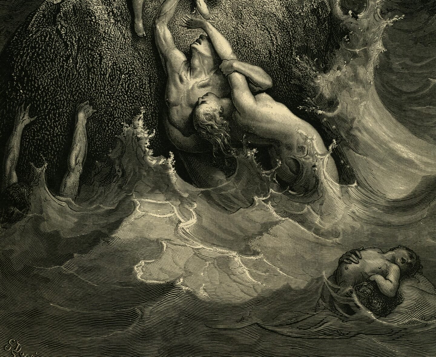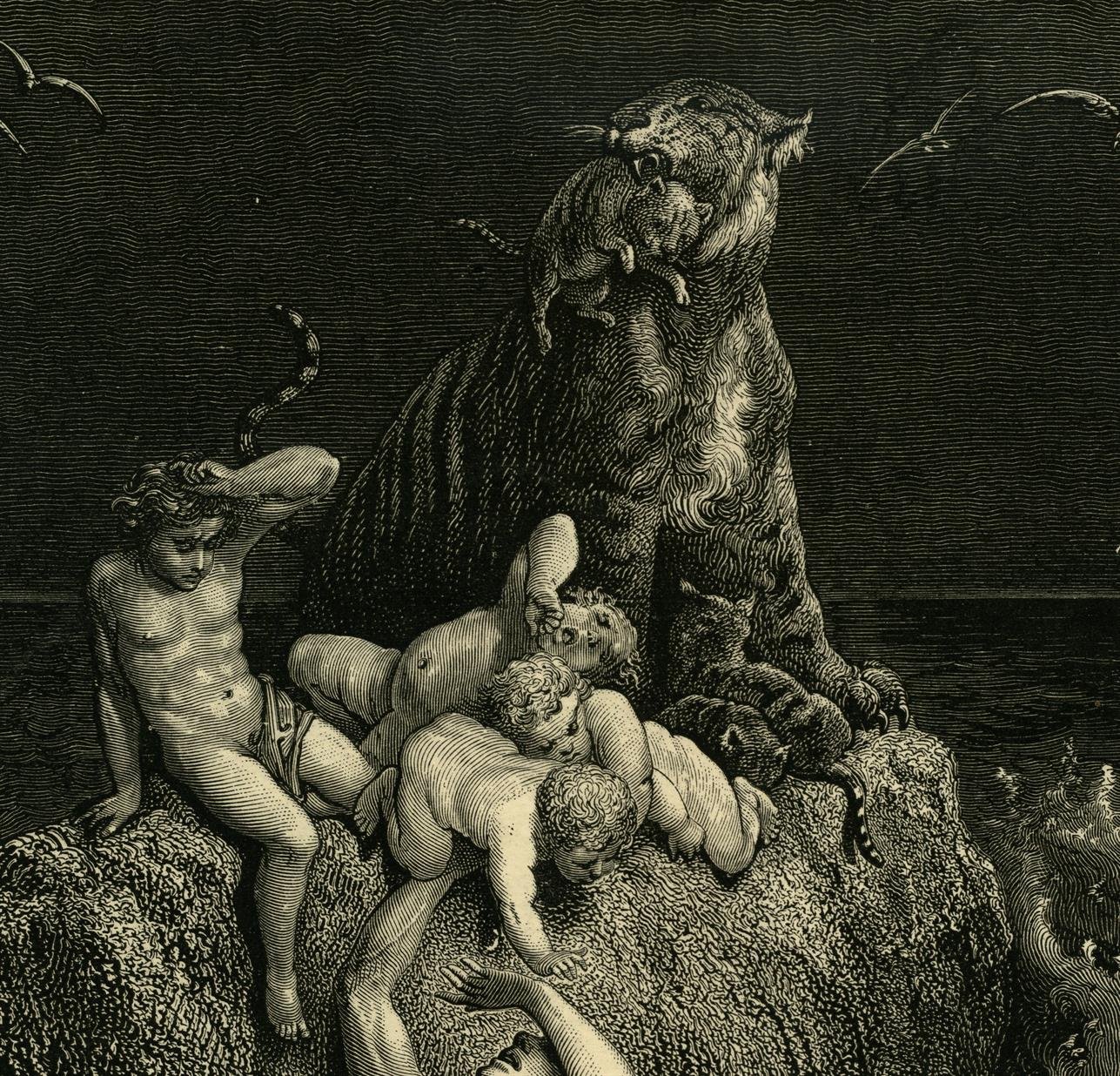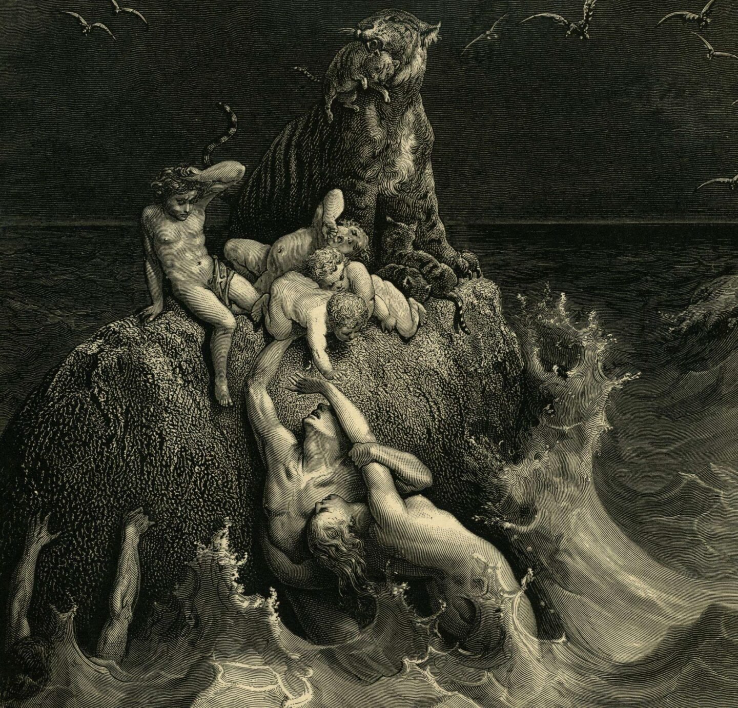 Esta impactante imagen es una de las interpretaciones visuales más dramáticas del relato bíblico del diluvio universal. Doré concentra toda la tragedia en un solo instante: una familia desesperada lucha por sobrevivir entre las rocas mientras las aguas suben y los cuerpos se acumulan. En la cima, un león y una leona buscan refugio, intensificando la carga emocional. No hay arca a la vista, solo desesperación y silencio. El paisaje es desolador y los tonos sombríos acentúan la atmósfera de castigo divino, dejando en claro que la escena es tanto religiosa como profundamente humana: el dolor de lo irremediable, la fuerza devastadora de la naturaleza, el juicio.