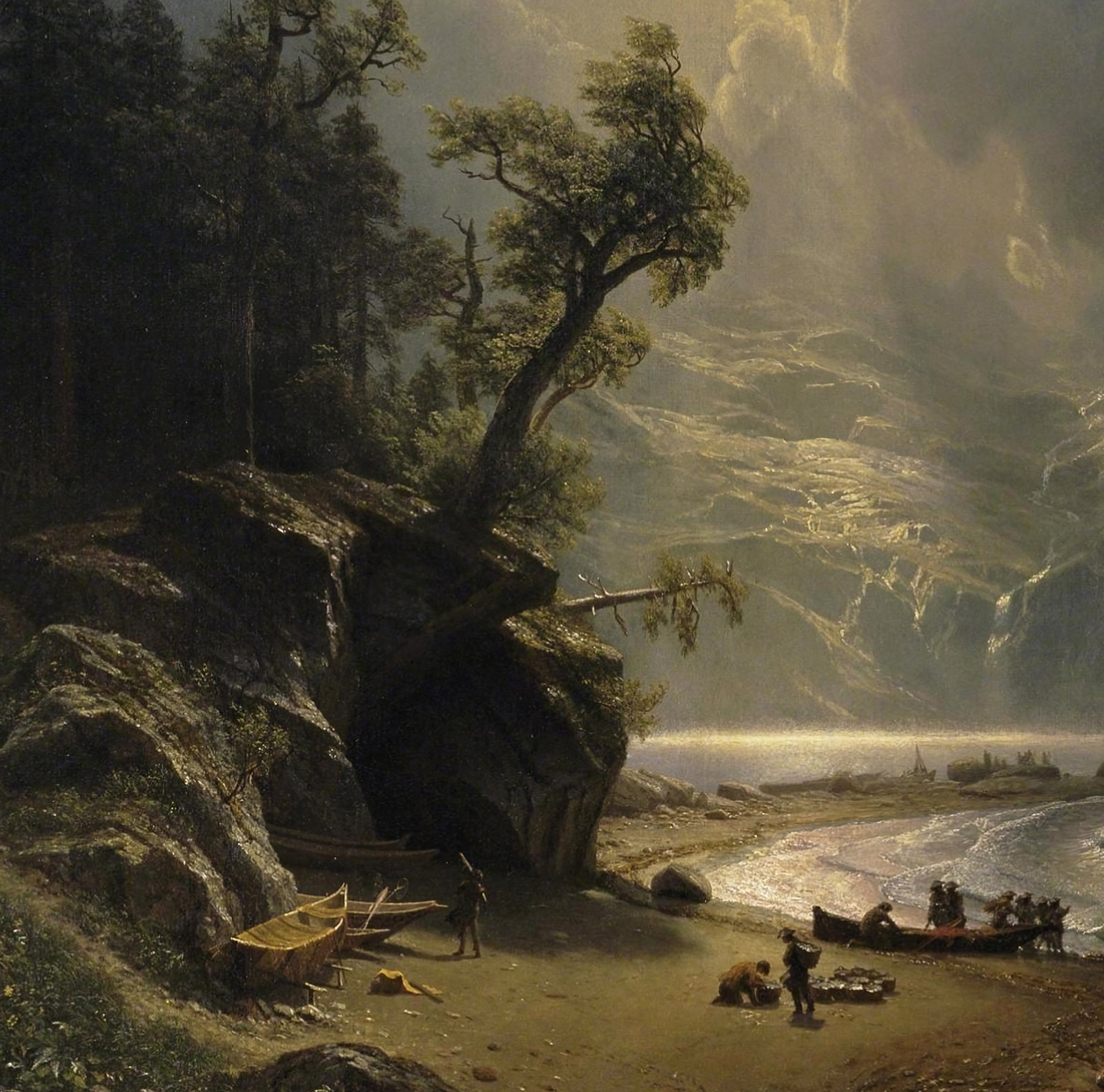 El estrecho de Puget en la costa del Pacífico (1870) retrata un paisaje vasto y sosegado del noroeste americano, donde un grupo de pueblos nativos navega en canoas sobre aguas calmas, envueltos por una atmósfera luminosa y reverente. Aunque Bierstadt nunca estuvo en ese punto exacto, se basó en relatos y bocetos de sus viajes al Oeste para crear esta escena idealizada. La obra transmite una visión armónica entre seres humanos y naturaleza, justo antes de la transformación radical que traerían la colonización y el desarrollo industrial. En lugar de un simple documento geográfico, esta pintura actúa como una evocación de un mundo en retirada, casi una elegía visual. El uso dramático de la luz refuerza esa sensación de quietud sagrada, como si capturara un instante detenido en el tiempo.