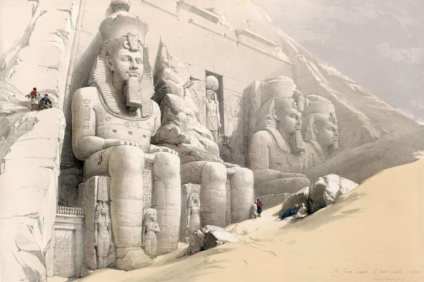 David Roberts (1796-1864), destacado pintor escocés del siglo XIX, es conocido por sus paisajes y escenas arqueológicas. Su obra maestra, «The Great Temple of Aboo Simble. Nubia» (1846-1849), refleja su fascinación por Egipto. En su viaje de 1838-1839, quedó maravillado por el Gran Templo de Aboo Simble en Nubia, inspirándolo a crear una obra extraordinaria.