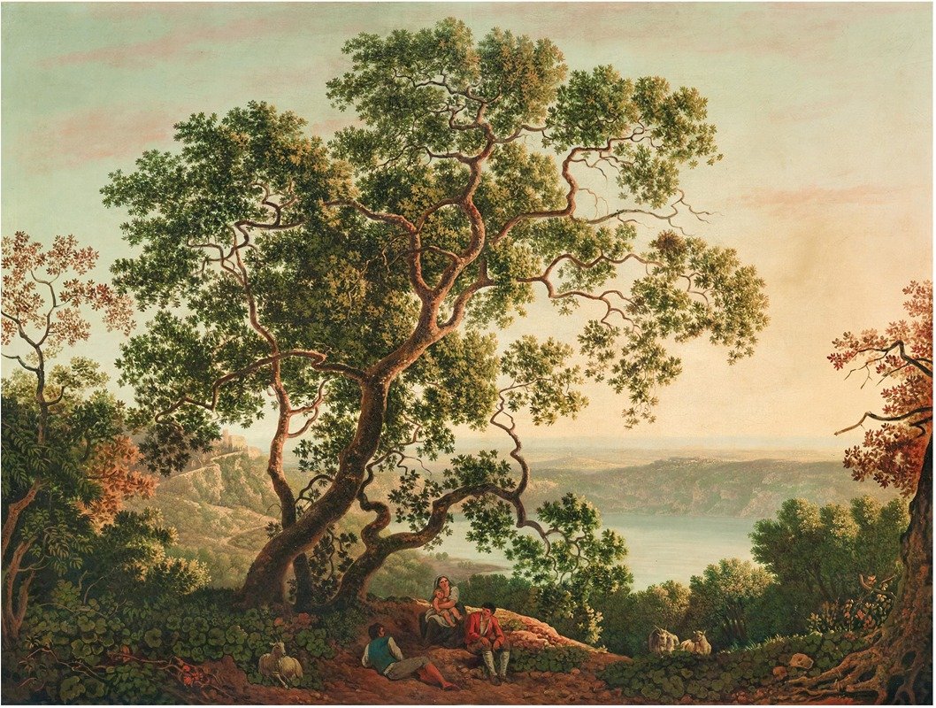El lago Nemi al anochecer con figuras y un rebaño de cabras descansando en primer plano