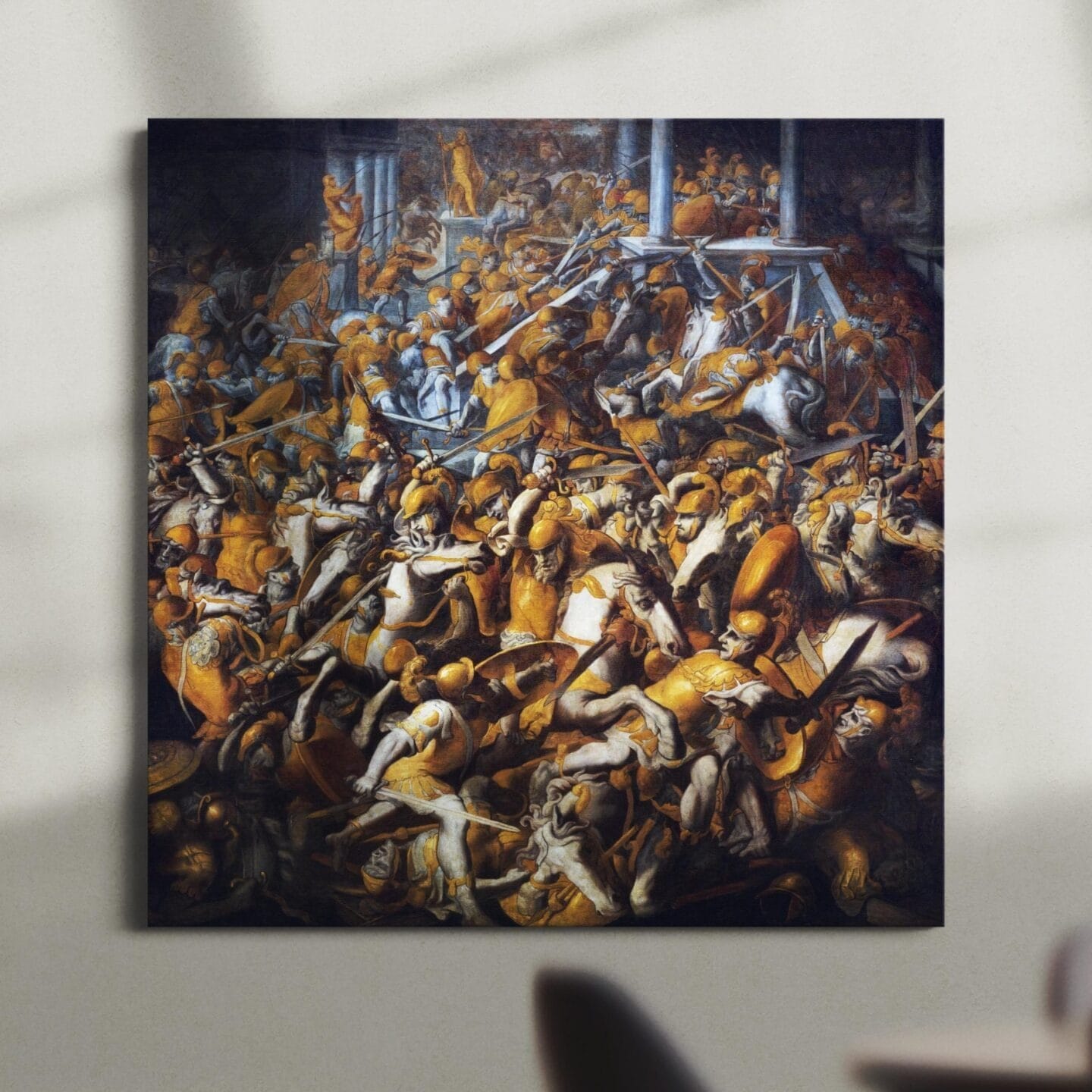 Históricamente, las escenas de batalla como esta no solo representaban la crudeza de la guerra, sino que también exaltaban el valor y la nobleza de la caballería, virtudes esenciales en una época de constantes conflictos en Italia. La Escuela Lombarda, activa en Lombardía, encontraba en estas escenas épicas una forma de simbolizar la lucha por el honor y el sacrificio. La falta de un autor específico añade un misticismo a la obra, permitiendo que se interprete como una visión colectiva de los ideales renacentistas. «Escena de Batalla de Caballería» es perfecta para quienes aprecian la historia del arte y buscan piezas que capturen la esencia de una época marcada por la gloria y la efímera naturaleza del heroísmo.