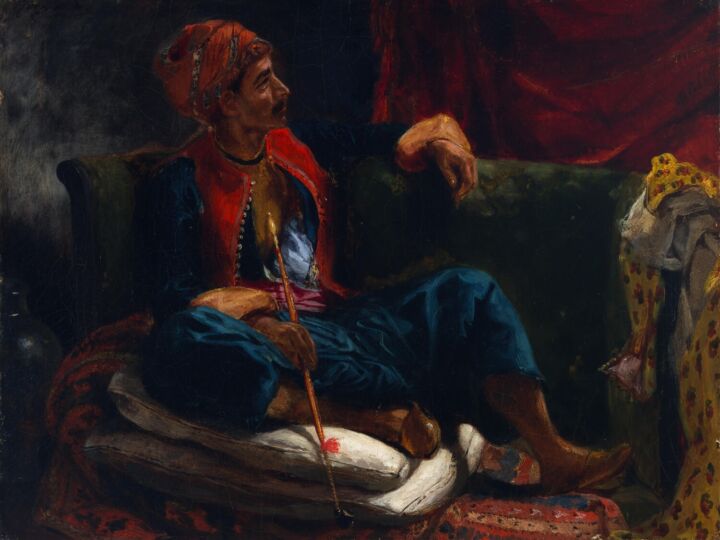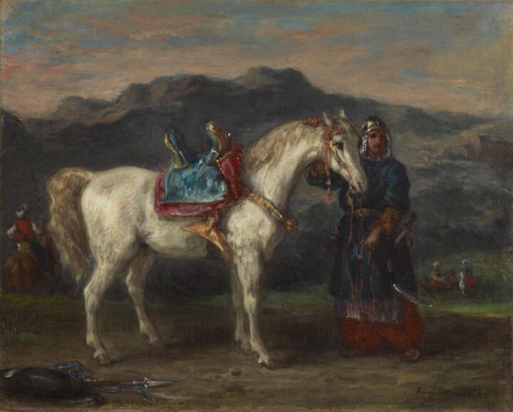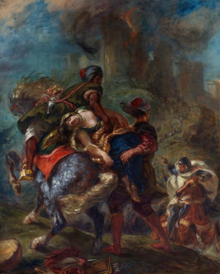 Ferdinand-Victor-Eugène Delacroix (Charenton-Saint-Maurice, Francia, 26 de abril de 1798-París, 13 de agosto de 1863) fue un pintor y litógrafo francés.1?2? Hijo del político Charles Delacroix3?, ministro de exteriores del Directorio, y de Victoire Oeben, que pertenecía a una familia de ebanistas, artesanos y dibujantes. Eugène fue el cuarto y último hijo del matrimonio. Al morir su padre, en 1805, siendo en ese momento prefecto de Gironda, Eugène se traslada con su familia a París, a casa de su hermana mayor Henriette de Verninac. Al año siguiente se inscribe en Liceo Imperial donde realiza estudios clásicos. En 1813 reside en casa de su primo Bataille en Valmont, lugar al que él permanecerá vinculado por su misterioso encanto, volviendo a él repetidas veces a lo largo de su vida. Desde Valmont visita Rouen, donde lo impresionan vivamente las ruinas medievales y el palacio de justicia gótica, que ya empieza a suscitarle el gusto por la arquitectura del medioevo. En 1814 muere su madre quedando huérfano pero bajo la protección de su hermana mayor Henriette.