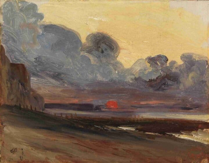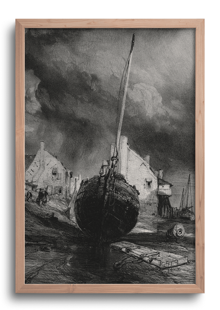 Eugène Isabey fue un pintor y acuarelista francés, célebre por sus paisajes marinos y escenas de naufragios que combinan el dramatismo romántico con una sensibilidad realista. Nació el 22 de julio de 1803 en París, en el seno de una familia artística —su padre, Jean-Baptiste Isabey, fue un renombrado pintor de miniaturas en la corte de Napoleón Bonaparte— lo que le permitió acceder desde joven a los círculos artísticos franceses. Isabey se especializó en la pintura de escenas marinas y costeras, donde el juego entre la luz, la tormenta y el mar encrespado crea una sensación de peligro y misterio. Obras como «Naufragio en la costa» y «Puerto de Normandía» reflejan su capacidad para captar el movimiento de las olas y el dramatismo del cielo, utilizando una paleta de colores oscuros y tonos fríos que refuerzan la atmósfera turbulenta. A menudo, incluía figuras humanas que luchan contra las fuerzas de la naturaleza, lo que introduce una tensión narrativa en la composición.