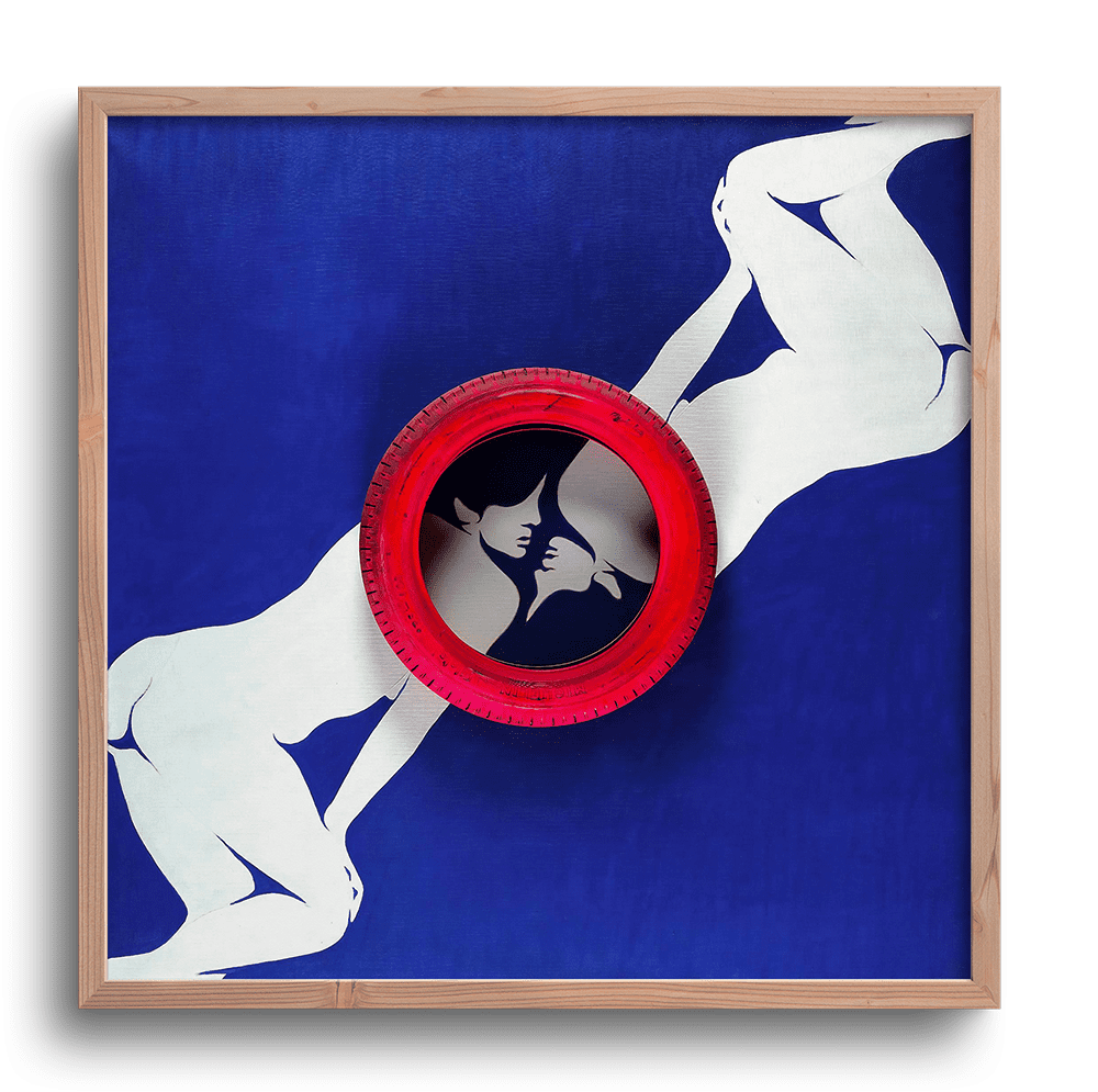Una de las obras más icónicas del arte pop feminista europeo, Valentine fue creada en 1966 por la belga Evelyne Axell en un contexto de revolución cultural, sexual y artística. La escena presenta dos cuerpos femeninos desnudos enfrentados, recortados en plexiglás blanco sobre un fondo azul intenso, unidos por un aro de automóvil pintado de rojo que encierra dos bocas a punto de besarse. El conjunto, con materiales industriales y formato tridimensional, irrumpe en el lenguaje tradicional de la pintura para abrir paso a una estética audaz y provocativa que desafía los límites entre deseo, consumo, erotismo y arte.