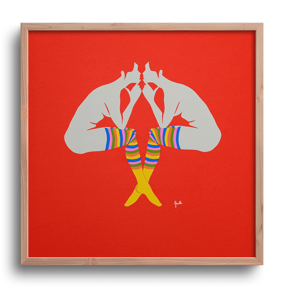 Con una estética vibrante y provocadora, Valentine’s Day forma parte de la serie más radical de Evelyne Axell, donde el deseo lésbico y la fantasía erótica son reivindicados con fuerza y color. En esta composición, dos figuras femeninas espejadas, delineadas en blanco sobre un fondo rojo puro, se besan mientras sus piernas lucen medias multicolores que evocan alegría y juego, pero también orgullo e identidad. La obra combina formas estilizadas y símbolos pop con un enfoque explícitamente político sobre el cuerpo y el amor.