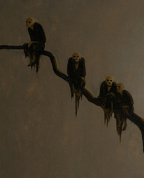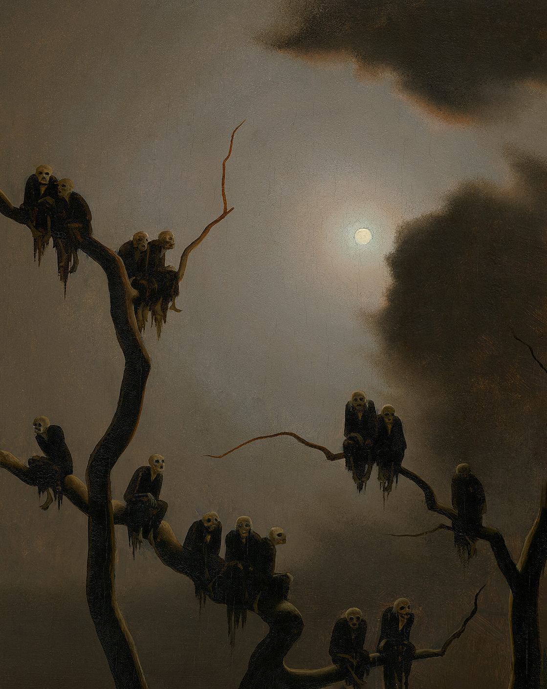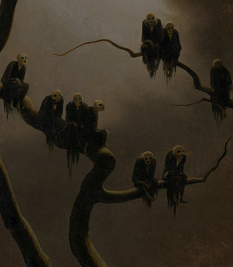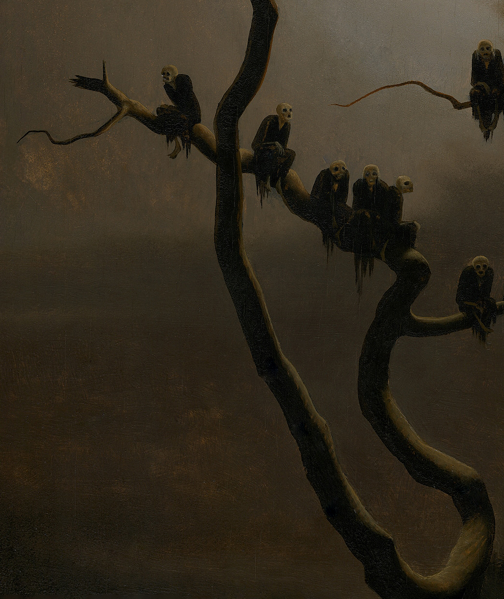 Un árbol seco, de ramas desnudas, se recorta sobre un terreno baldío sumido en niebla. Suspendidos de sus brazos retorcidos, flotan cuerpos traslúcidos: presencias humanas que no gritan ni actúan, simplemente están. La escena no representa un hecho puntual, pero se inscribe con fuerza en el imaginario europeo del período de entreguerras. Las figuras colgantes no remiten a martirio religioso ni a justicia: son emblemas del olvido, del trauma, de lo que permanece irresuelto en la historia. En el contexto de la República de Weimar y la crisis de identidad austrohúngara, Fantasmas en un árbol puede leerse como una reflexión visual sobre la memoria colectiva y su incapacidad de sanar tras el desastre. Sedlacek no ofrece consuelo ni catarsis, sino una imagen detenida, sin salida narrativa, donde el tiempo parece haberse fracturado.