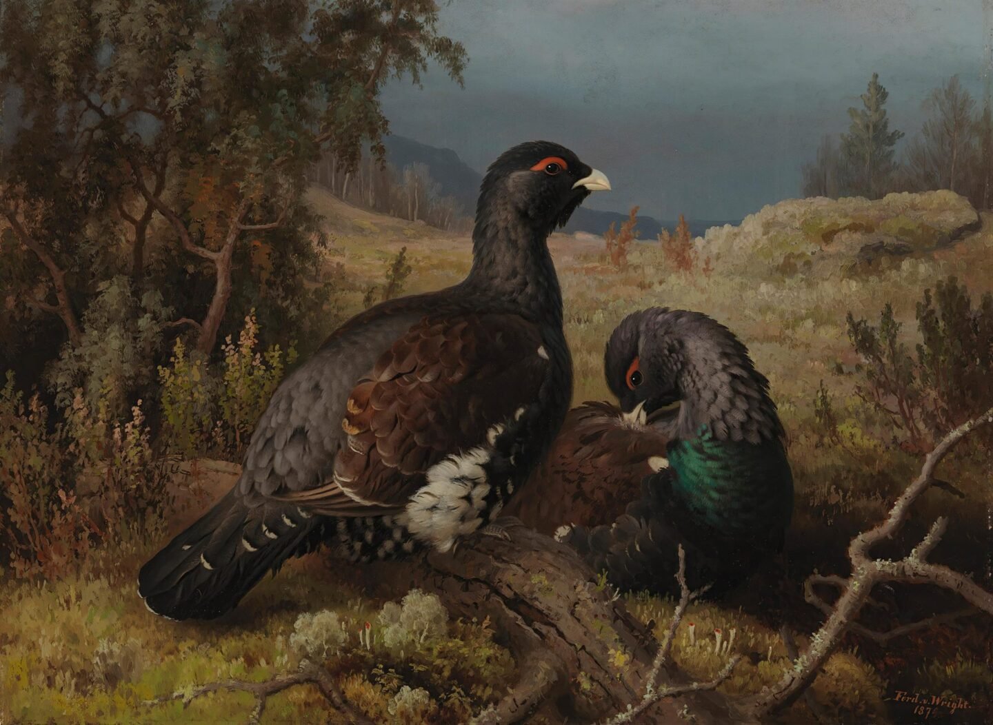 Ferdinand von Wright provenía de una familia acomodada y culta, donde el arte y la ciencia eran valores fundamentales. Tanto él como sus hermanos, Magnus y Wilhelm von Wright, también fueron reconocidos pintores y naturalistas, lo que creó un entorno creativo que influyó en su obra desde joven. Mientras Magnus y Wilhelm se centraban más en la ilustración científica, Ferdinand exploró la tensión entre la realidad biológica y la representación artística, destacándose por su capacidad para transmitir vida y carácter en cada una de sus aves. A pesar de una enfermedad crónica que limitó su movilidad en sus últimos años, continuó pintando con una precisión extraordinaria, a menudo desde la ventana de su casa en Haminalahti. Su obra forma parte de la tradición del realismo naturalista, influenciada por el romanticismo nórdico, donde la naturaleza se presenta no solo como un entorno físico sino como un espacio simbólico cargado de emoción y drama. La obra de von Wright trasciende el simple registro ornitológico, convirtiendo cada escena en una expresión de las complejas dinámicas de la vida y la muerte en la naturaleza. Su legado sigue siendo un punto de referencia en la pintura finlandesa, y su capacidad para combinar la observación científica con una sensibilidad artística profunda es lo que lo distingue como un maestro del arte naturalista.