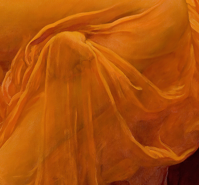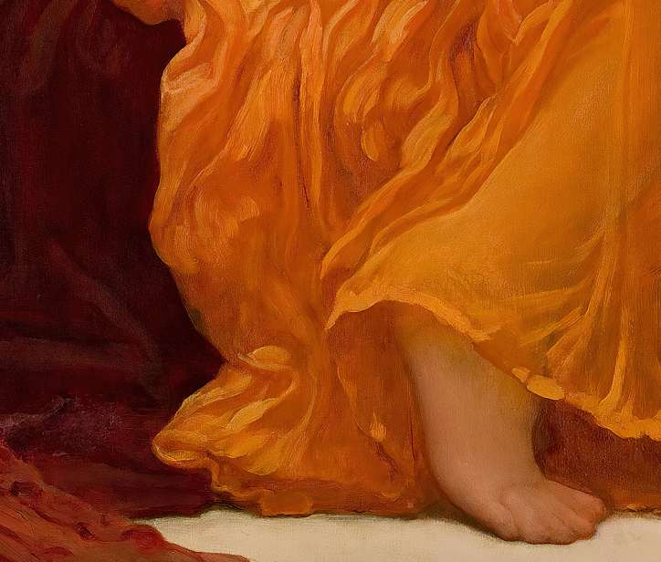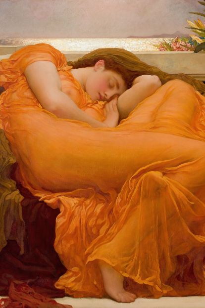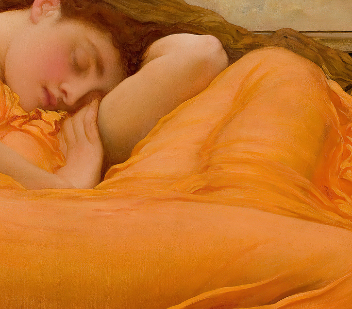 «Flaming June» (Junio Llameante) es una de las obras maestras más reconocidas del pintor británico Frederic Leighton, finalizada en 1895. La pintura muestra a una mujer dormida sobre una silla con un vestido de un vibrante naranja traslúcido que evoca la calidez y la serenidad del verano. Esta obra destaca por su intrincado detalle, el uso exuberante del color y una atmósfera de calma que es al mismo tiempo hipnótica y enigmática. Leighton utiliza una paleta de tonos cálidos que capturan la intensidad de la luz y el calor estival, logrando transmitir una sensación de quietud en la postura relajada de la figura, envuelta en un sueño profundo. El vestido, fluido y casi etéreo, se pliega alrededor de su cuerpo en formas que evocan los reflejos y las ondas del fuego o del sol poniente, reforzando el título de la pintura.