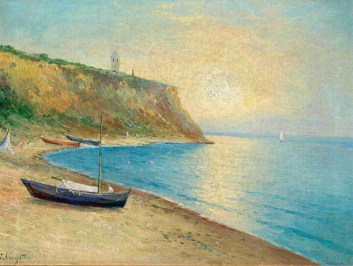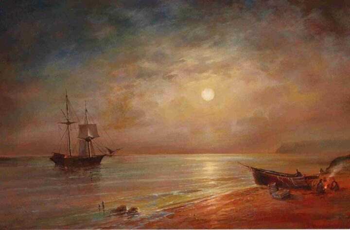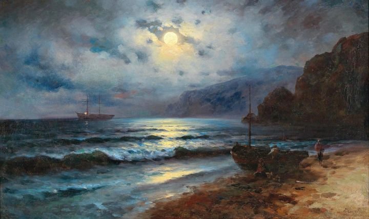 Pintor ucraniano profundamente vinculado al paisaje marino y forestal del sur de Ucrania y Crimea. Formado inicialmente en química, abrazó el arte tras estudiar en la Academia de San Petersburgo y, posteriormente, becado en la escuela del célebre Ivan Aivazovsky en Feodosia. En un periodo de intensos cambios —el fin del Imperio Ruso y las primeras convulsiones políticas— Kapustin se centró en una pintura delicada, serena y evocadora. Sus escenas nocturnas y amaneceres marinos no narran historias explícitas, pero sí capturan la intimidad del ánimo humano frente a la inmensidad natural, reflejando una época de transición: la explosión industrial y política contrasta con la quietud de sus mares iluminados por la luna o al amanecer.