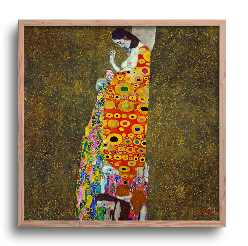 Gustav Klimt (1862–1918) fue uno de los máximos exponentes del simbolismo y líder de la Secesión de Viena. Su obra articula lo erótico, lo espiritual y lo decorativo con una complejidad pocas veces alcanzada. En Esperanza II, Klimt mezcla su formación académica con influencias bizantinas, arte japonés y la visión psicoanalítica emergente en la Viena de Freud. Pintaba en túnicas largas, en un taller que parecía más un santuario que un estudio. Fue amado y resistido por igual: sus temas sexuales y alegóricos incomodaban a los sectores conservadores, pero capturaban como nadie el malestar y la fascinación de una época que vivía el final de un mundo. Su lenguaje dorado no fue mero lujo: fue un intento de recuperar lo sagrado desde el deseo y la carne.