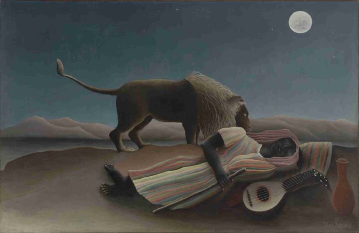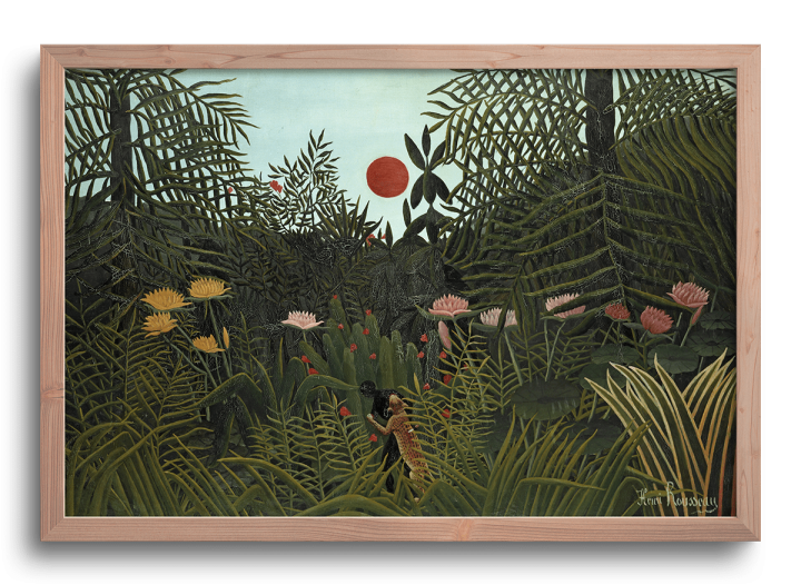 A pesar de las críticas iniciales y las burlas de los círculos académicos, Rousseau fue reconocido por artistas de vanguardia como Pablo Picasso y Robert Delaunay, quienes admiraban la pureza y la frescura de su estilo. Una curiosidad sobre Rousseau es que en 1908, Picasso organizó una cena en su honor en su taller del Bateau-Lavoir, donde reconoció públicamente el talento de Rousseau, marcando el inicio de su reconocimiento entre los modernistas. Rousseau pintaba con una meticulosidad casi infantil, pero detrás de esa aparente simplicidad se esconde una sofisticación compositiva y simbólica. Su capacidad para crear un mundo propio, donde las fieras y la vegetación conviven en armonía, influyó en movimientos posteriores como el surrealismo y el arte naïf. Rousseau murió en la pobreza en 1910, pero hoy es celebrado como un pionero de la modernidad, cuyo arte combina la inocencia y la imaginación con una fuerza simbólica innegable. Las etiquetas que mejor describen su obra son primitivismo moderno y realismo onírico.