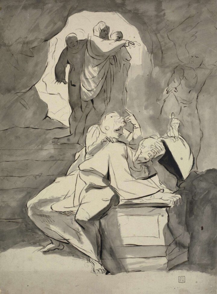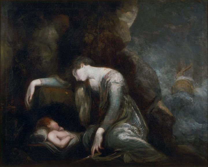 La obra no solo resalta la conexión entre los personajes, sino que también explora el impacto del duelo en sus vidas. Fuseli usa el claroscuro para intensificar la atmósfera dramática y resaltar las expresiones de dolor y desesperación, mientras que la representación estilizada de las figuras refleja la agitación interna de los personajes. El título, por tanto, encapsula la esencia de la escena, subrayando el tema de la tragedia personal y el vínculo familiar en tiempos de crisis.