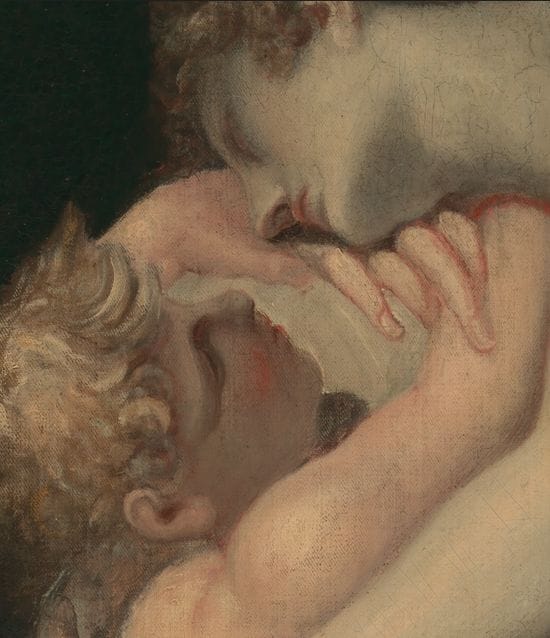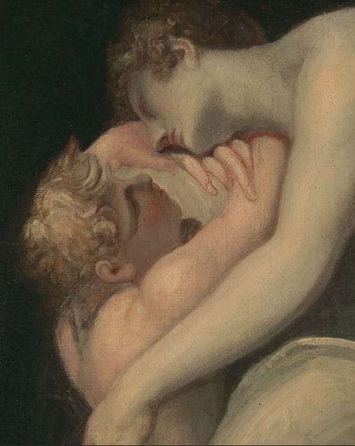 La obra no solo resalta la conexión entre los personajes, sino que también explora el impacto del duelo en sus vidas. Fuseli usa el claroscuro para intensificar la atmósfera dramática y resaltar las expresiones de dolor y desesperación, mientras que la representación estilizada de las figuras refleja la agitación interna de los personajes. El título, por tanto, encapsula la esencia de la escena, subrayando el tema de la tragedia personal y el vínculo familiar en tiempos de crisis.
