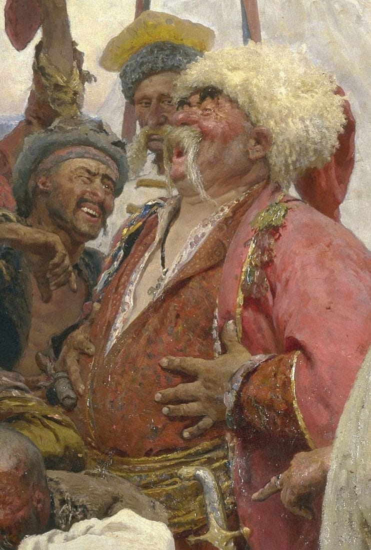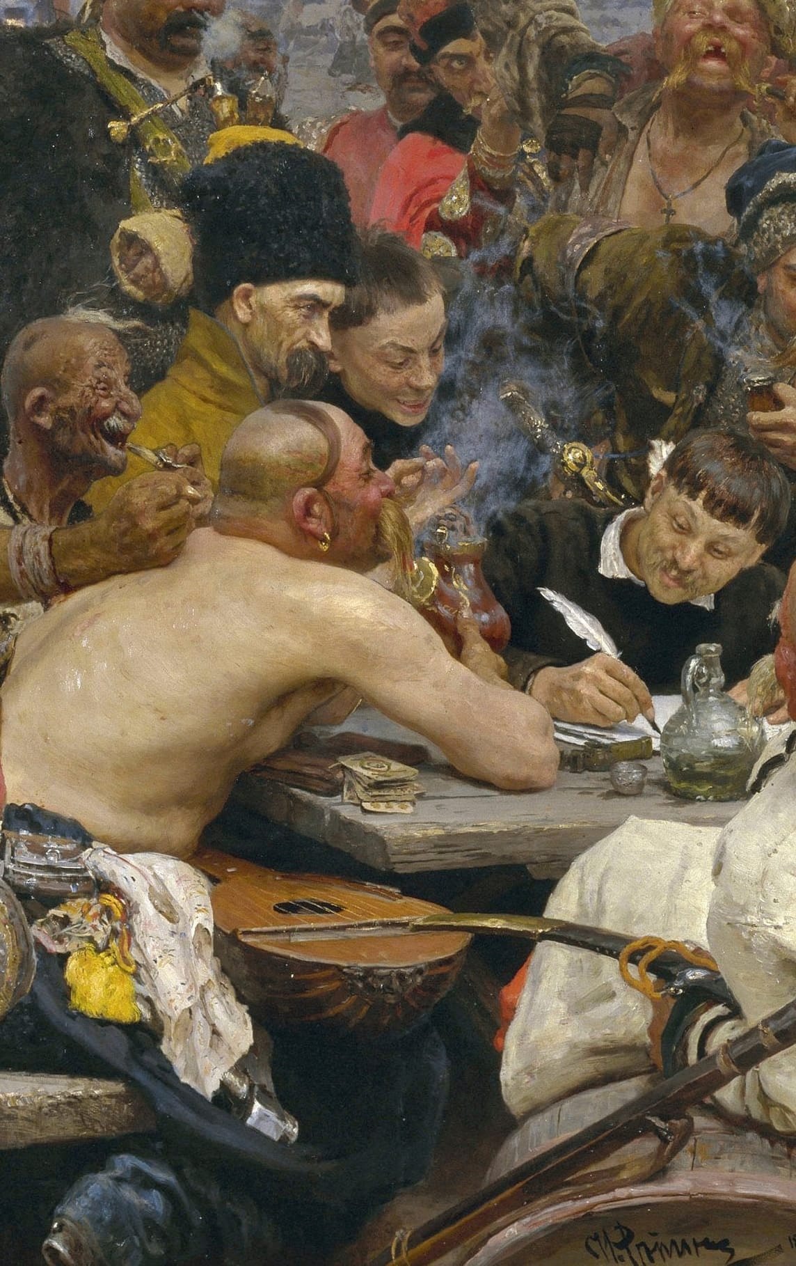 La obra recrea una leyenda del siglo XVII: ante la exigencia de rendición del sultán otomano Mehmed IV, los cosacos dictan una respuesta burlona, entre risas. Repin estudió gestos, trajes y rostros para capturar el desafío colectivo y el humor como arma. El lienzo fue adquirido por el zar Alejandro III en 1891 (hoy en el Museo Estatal Ruso de San Petersburgo); existe otra versión en Járkov.