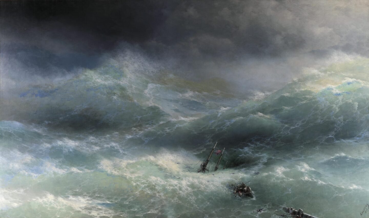 La obra de Iván Konstantínovich Aivazovsky (1817–1900) es un himno al mar en todas sus formas: tempestuoso, calmo, infinito. Considerado uno de los grandes maestros del romanticismo ruso, dedicó su vida a pintar el océano como un ser vivo, capaz de reflejar tanto la furia de la naturaleza como la fragilidad del ser humano frente a ella.