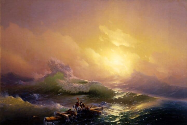 La obra de Iván Konstantínovich Aivazovsky (1817–1900) es un himno al mar en todas sus formas: tempestuoso, calmo, infinito. Considerado uno de los grandes maestros del romanticismo ruso, dedicó su vida a pintar el océano como un ser vivo, capaz de reflejar tanto la furia de la naturaleza como la fragilidad del ser humano frente a ella.