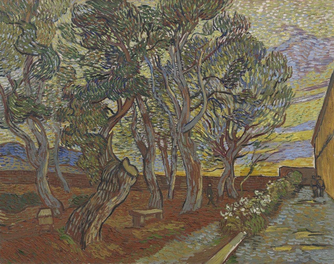 Vibrantes colores y pinceladas enérgicas en el jardín de un asilo en Saint-Rémy. Vincent van Gogh, postimpresionista, es famoso por su intensa expresión emocional y uso revolucionario del color.