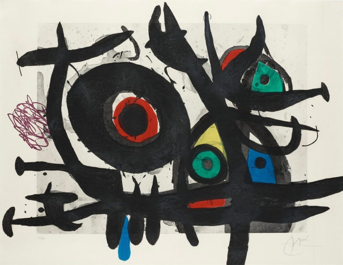 Joan Miró i Ferrà (Barcelona, 20 de abril de 1893-Palma de Mallorca, 25 de diciembre de 1983) fue un pintor, escultor, grabador y ceramista español, considerado uno de los máximos representantes del surrealismo. En sus obras reflejó su interés en el subconsciente, en lo «infantil» y en la cultura y tradiciones de Cataluña. Aunque se le asocia al arte abstracto por su estilo maduro de formas estilizadas e imaginarias, en su juventud se inició en la figuración, con fuertes influencias fauvistas, cubistas y expresionistas, pasando a una pintura plana con cierto aire naïf, como lo es su conocido cuadro La Masía del año 1920. A partir de su estancia en París, su obra se vuelve más fantasiosa y onírica, coincidiendo con los puntos del surrealismo e incorporándose a este movimiento.1? En numerosas entrevistas y escritos que datan de la década de 1930, Miró manifestó su deseo de abandonar los métodos convencionales de pintura, en sus propias palabras de «matarlos, asesinarlos o violarlos», para poder favorecer una forma de expresión que fuese contemporánea, y no querer doblegarse a sus exigencias y a su estética ni siquiera con sus compromisos hacia los surrealistas.2?