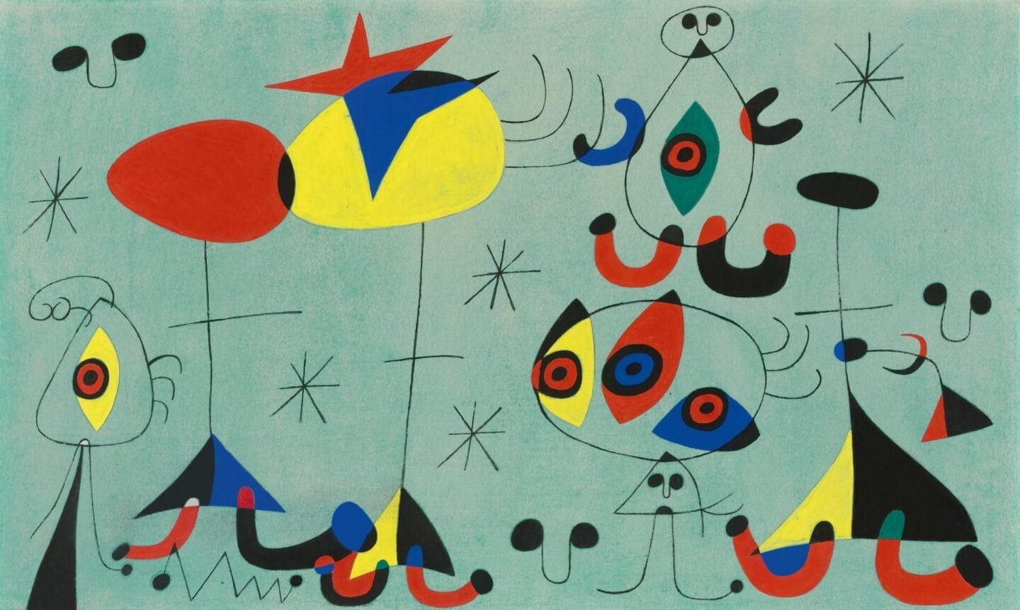Joan Miró fue un pintor, escultor y ceramista español, reconocido por su papel en el desarrollo del surrealismo y por su estilo abstracto cargado de símbolos, formas biomorfas y colores primarios. Nació el 20 de abril de 1893 en Barcelona, en el seno de una familia de artesanos y joyeros, lo que influyó en su temprana relación con el arte y el diseño. Miró comenzó su formación en la Escuela de Bellas Artes de Barcelona, pero su estilo inicial estuvo marcado por el fauvismo y el cubismo, visible en obras como «Retrato de una bailarina» (1917). Sin embargo, fue tras su estancia en París en la década de 1920 cuando entró en contacto con los surrealistas y comenzó a desarrollar un lenguaje artístico personal basado en el subconsciente y la automatización. Obras como «La granja» (1921-1922) y «Carnaval de arlequín» (1924-1925) reflejan esta transición, donde Miró combina elementos reconocibles de la vida cotidiana (animales, estrellas, figuras humanas) con formas abstractas y una composición libre que parece desafiar la gravedad.