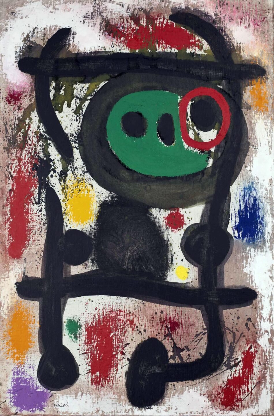 Miró fue un artista experimental que rechazaba las convenciones académicas y buscaba una conexión directa con la esencia espiritual y primitiva del arte. Su obra evolucionó hacia una abstracción más radical en la década de 1930, con figuras geométricas flotantes y colores vibrantes que reflejan una visión poética y onírica del mundo. Durante la Guerra Civil Española y la Segunda Guerra Mundial, sus pinturas adquirieron un tono más oscuro y simbólico, reflejando la violencia y la tensión de la época. Una curiosidad sobre Miró es que a pesar de su vinculación con el surrealismo, nunca quiso definirse como surrealista, ya que consideraba que su arte surgía de una conexión más directa con la naturaleza y el subconsciente. En sus últimos años, exploró la pintura a gran escala y la escultura, creando murales y tapices para espacios públicos como el mural de la UNESCO en París (1958). Su lenguaje simbólico y su rechazo a las normas establecidas influyeron en movimientos posteriores como el expresionismo abstracto y el arte conceptual. Miró murió en Palma de Mallorca en 1983, dejando un legado artístico que redefinió el arte moderno. Las etiquetas que mejor describen su obra son surrealismo abstracto y automatismo simbólico.