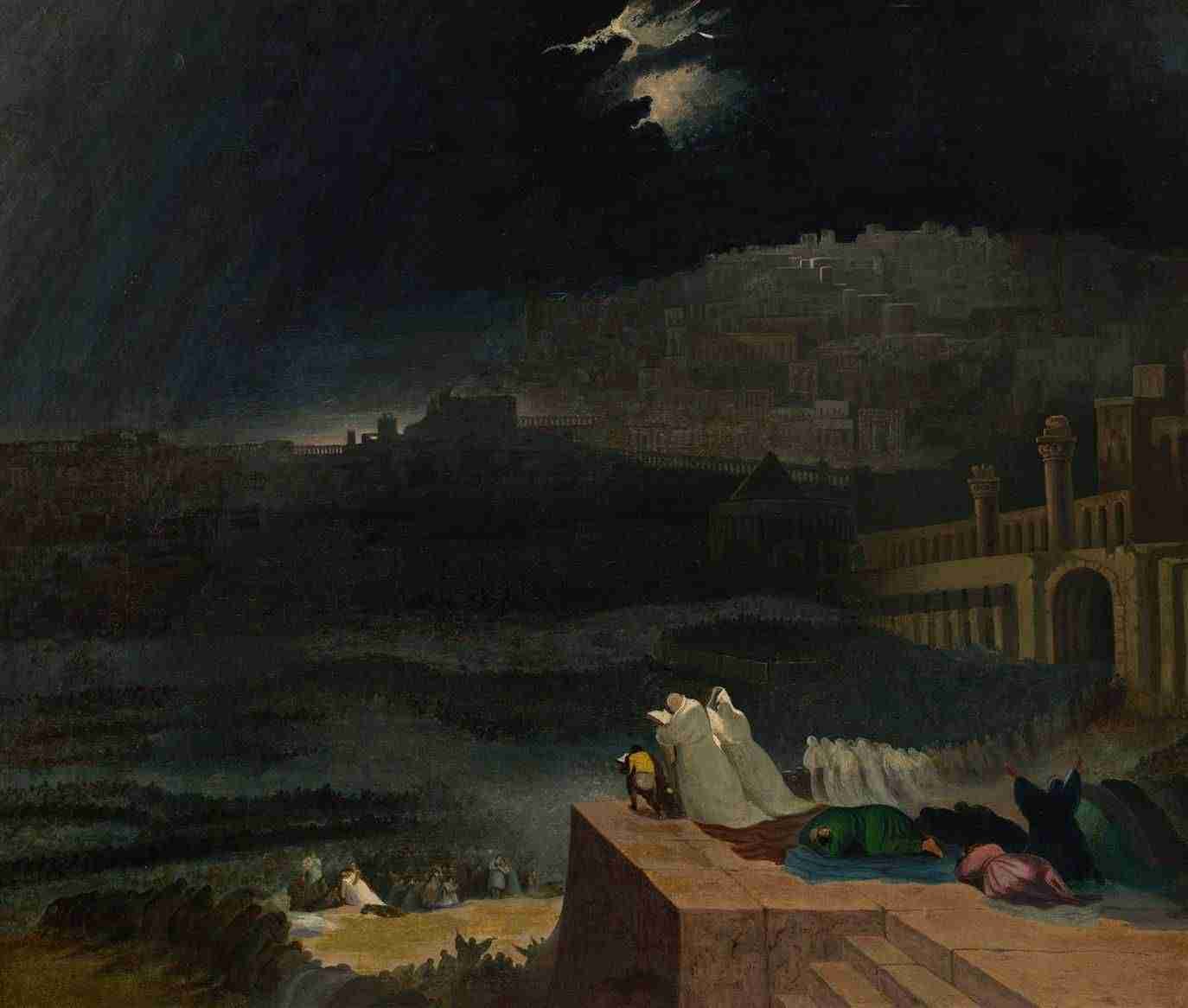 Ficha: El pintor y grabador británico John Martin se hizo famoso con escenas sublimes de vastos espacios abrumados por la arquitectura clásica e innumerables figuras. Joshua ordenando al sol que se detenga sobre Gabaón muestra a Joshua, el comandante de los ejércitos israelitas del Antiguo Testamento, parado en el afloramiento rocoso en primer plano. Él ordena que el sol y la luna se detengan en su curso para que los israelitas puedan destruir a sus enemigos que huyen, los amorreos, que habían estado atacando la ciudad de Gabaón, en la luz prolongada del día.