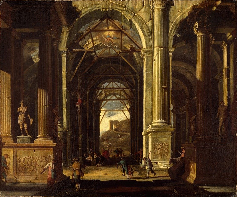 Adoración de pastores. Esta segunda obra de Viviano Codazzi trata Natividad. El artista combina especialización arquitectónica con tema religioso. La escena incluye ruinas que simbolizan fin del paganismo. Obra que equilibra vedutismo con narrativa sagrada.