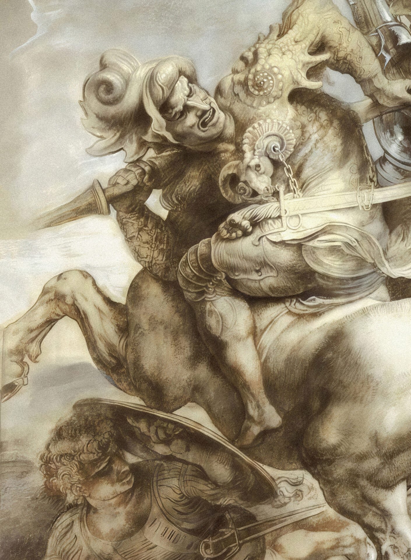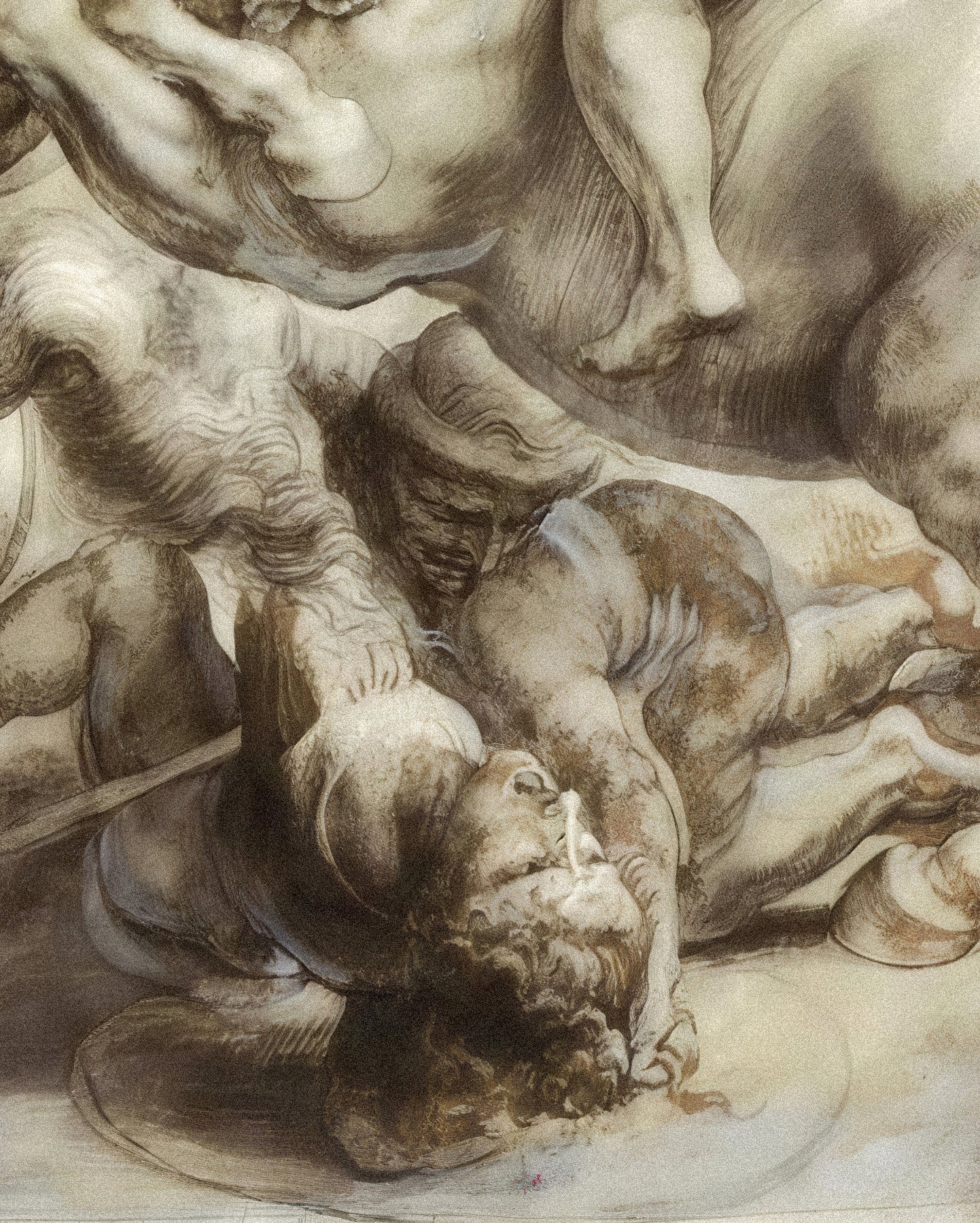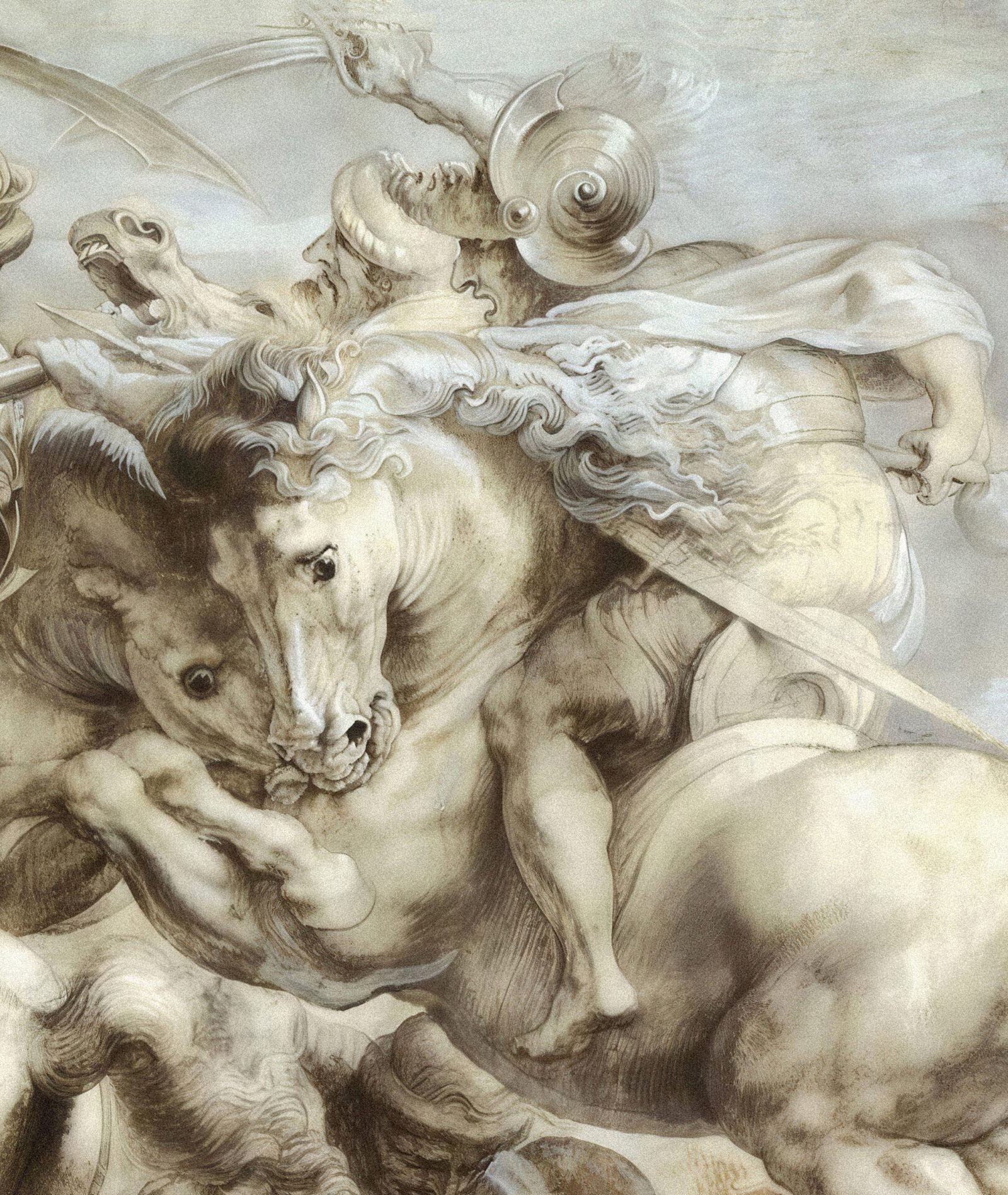 Rubens conoció la composición a través de esos materiales durante su estancia en Italia y realizó esta versión alrededor de 1603–1604. Se concentra en el núcleo más célebre del mural: la lucha feroz por el estandarte, donde hombres y caballos se funden en un combate cuerpo a cuerpo, sin paisaje ni contexto heroico. No hay estrategia ni gloria: hay tensión muscular, violencia desatada y rostros deformados por el esfuerzo. La elección de Rubens de preservar este fragmento responde tanto a un interés artístico —la anatomía en movimiento, la energía del choque— como a una comprensión histórica del sentido original de la obra: mostrar la guerra como una fuerza brutal que domina a los cuerpos, incluso en el corazón del poder político florentino.