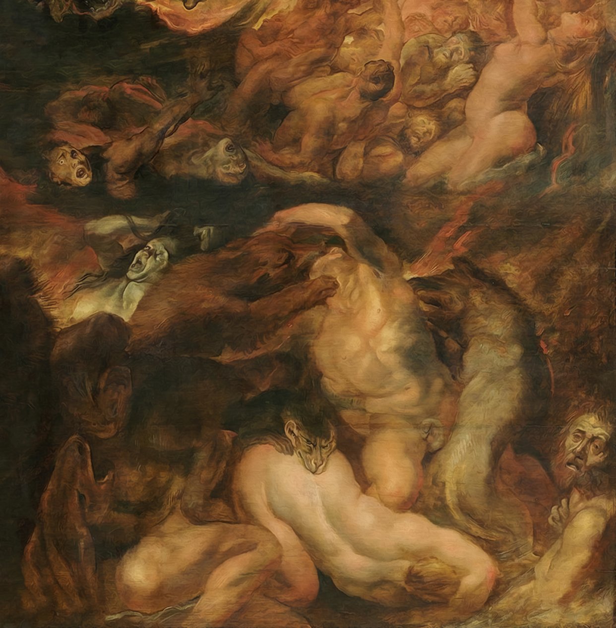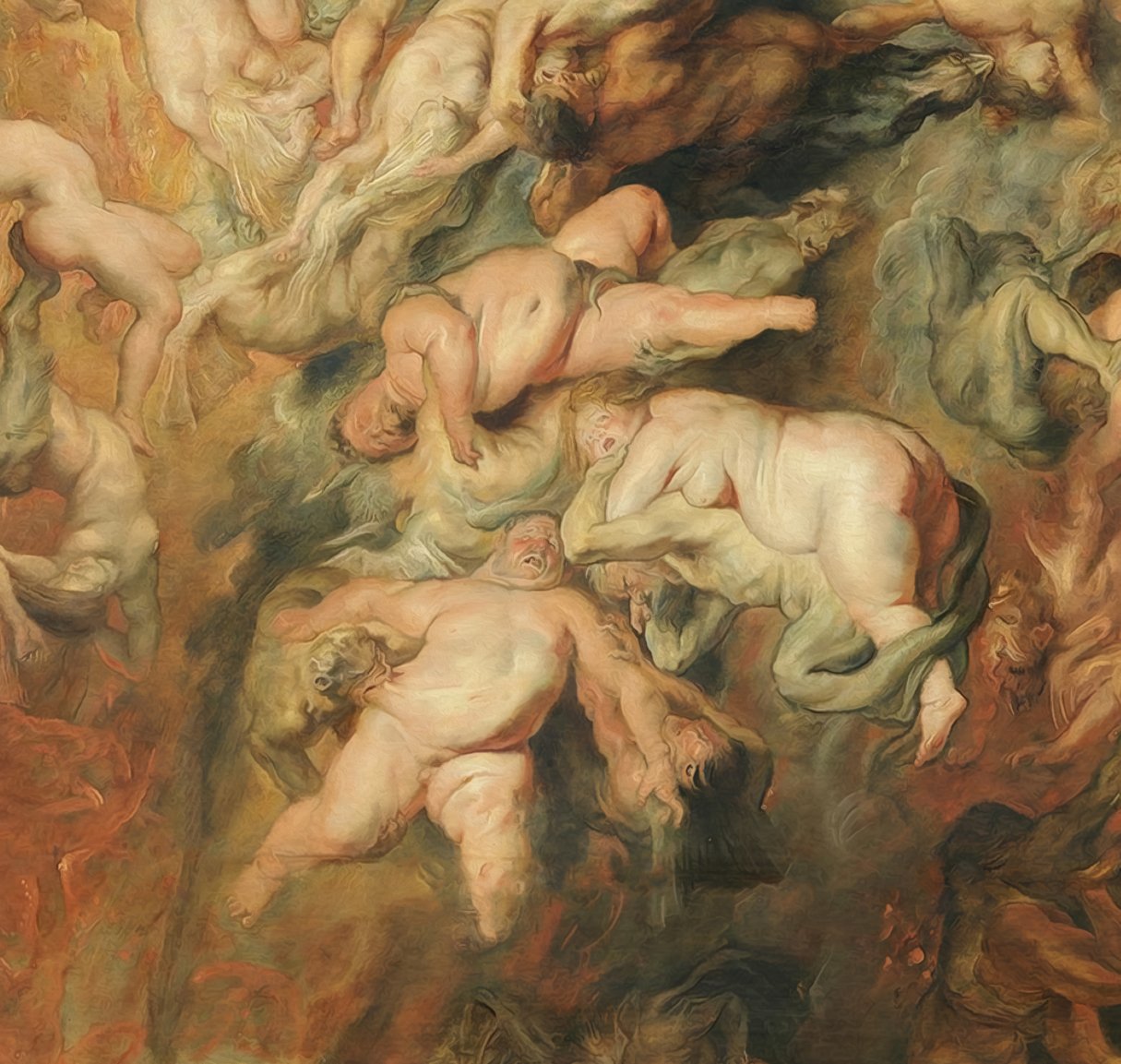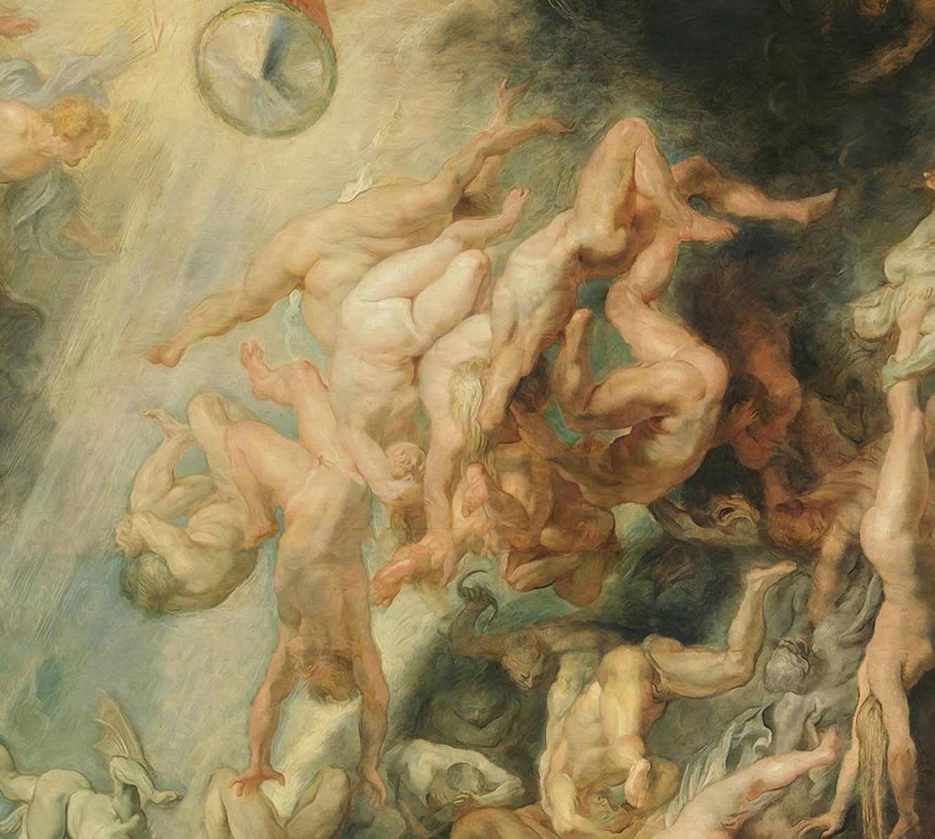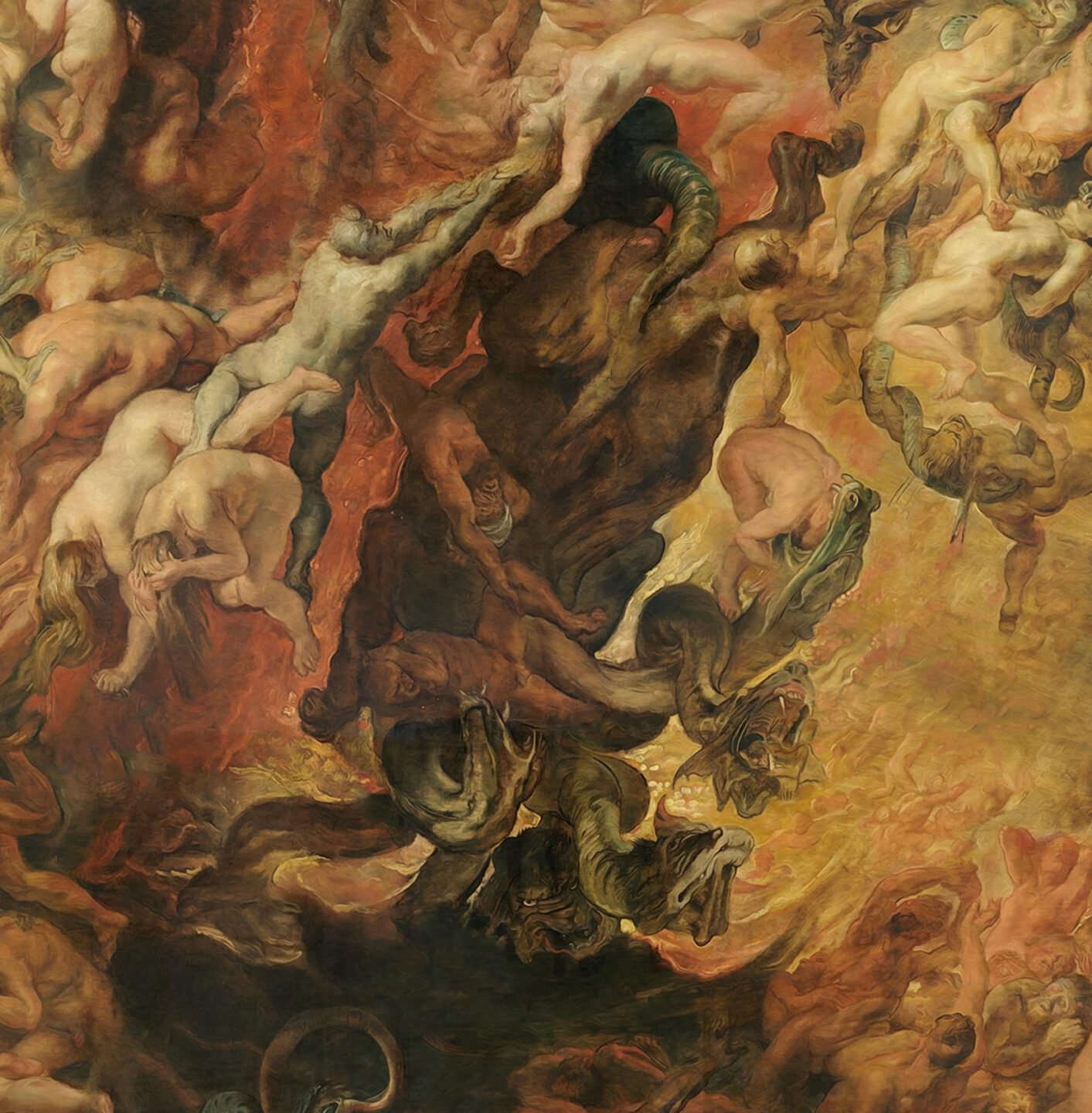 Una multitud de cuerpos desnudos, enredados entre sí y atrapados en una caída interminable hacia las fauces del infierno, domina esta composición estremecedora de Rubens. Inspirado por La Divina Comedia y los textos bíblicos sobre el Juicio Final, el pintor flamenco representó el castigo eterno con una intensidad física sin precedentes. La escena no tiene horizonte ni refugio: todo es descenso, torsión y desesperación. Ángeles vengadores, con espadas desenvainadas, expulsan a los condenados al abismo. El uso de luces dramáticas y diagonales vertiginosas transforma el lienzo en una cascada humana de horror y movimiento perpetuo. Más que advertencia moral, esta pintura es un estudio de anatomía en caída libre y una coreografía del caos.