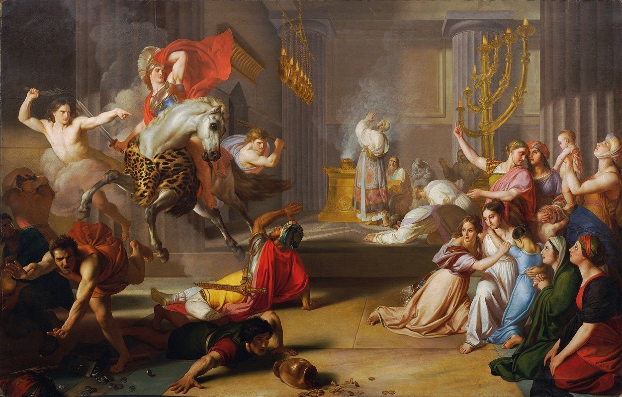 Expulsión de Heliodoro. Luigi Sabatelli (1772-1850) fue pintor neoclásico italiano. Trata episodio del libro de Macabeos. Trabajó en Milán y Florencia. Desarrolló estilo heroico influenciado por Miguel Ángel. Se especializó en temas históricos y religiosos. Representa neoclasicismo romántico italiano.