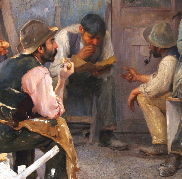 La hora del almuerzo (c. 1900) es una de las obras más significativas de Pío Collivadino, uno de los grandes pintores argentinos del cambio de siglo. La pintura retrata una escena cotidiana de trabajadores en un entorno fabril, un momento de pausa que invita a reflexionar sobre las condiciones laborales de la época. Collivadino, con su característico estilo realista social, plasma la humanidad y dignidad de los obreros, capturando su interacción en un ambiente de trabajo con pinceladas precisas y una paleta terrosa. La luz tenue que baña la composición refuerza la conexión entre los personajes y su entorno industrial, enfatizando el auge de la modernización en Buenos Aires a principios del siglo XX.