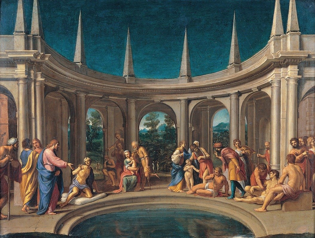 Piscina probática. Lucio Massari (1569-1633) fue pintor boloñés. Esta obra de 1605-1606 trata milagro de curación en piscina de Jerusalén. Alumno de los Carracci, trabajó en Bolonia. Desarrolló estilo clasicista de escuela boloñesa. Representa generación de discípulos de Carracci.