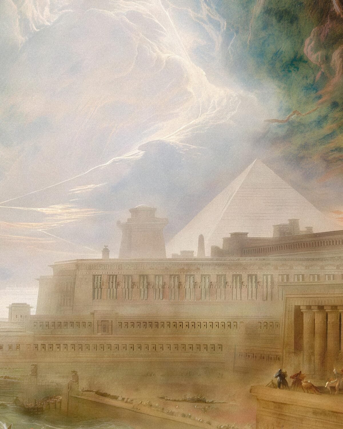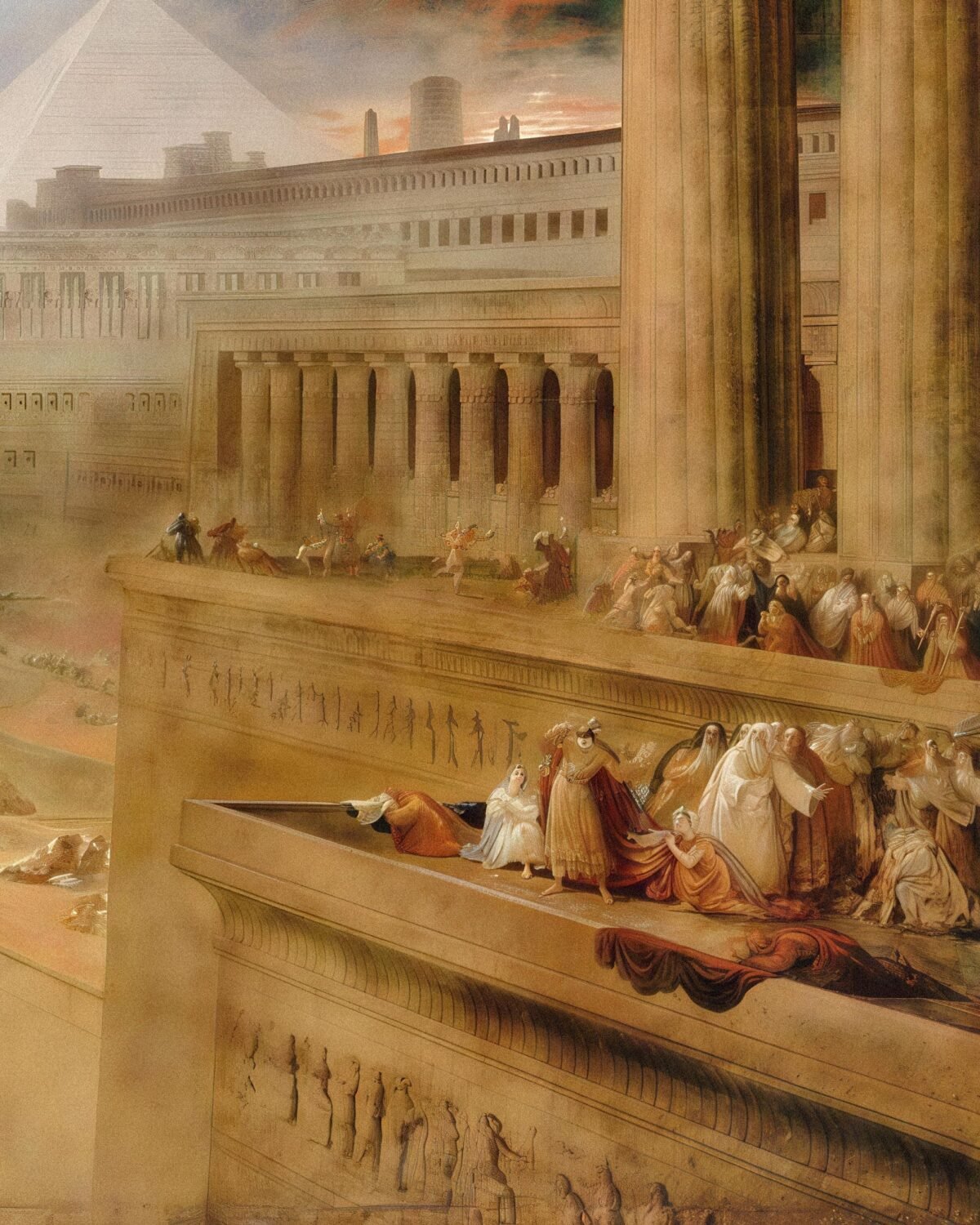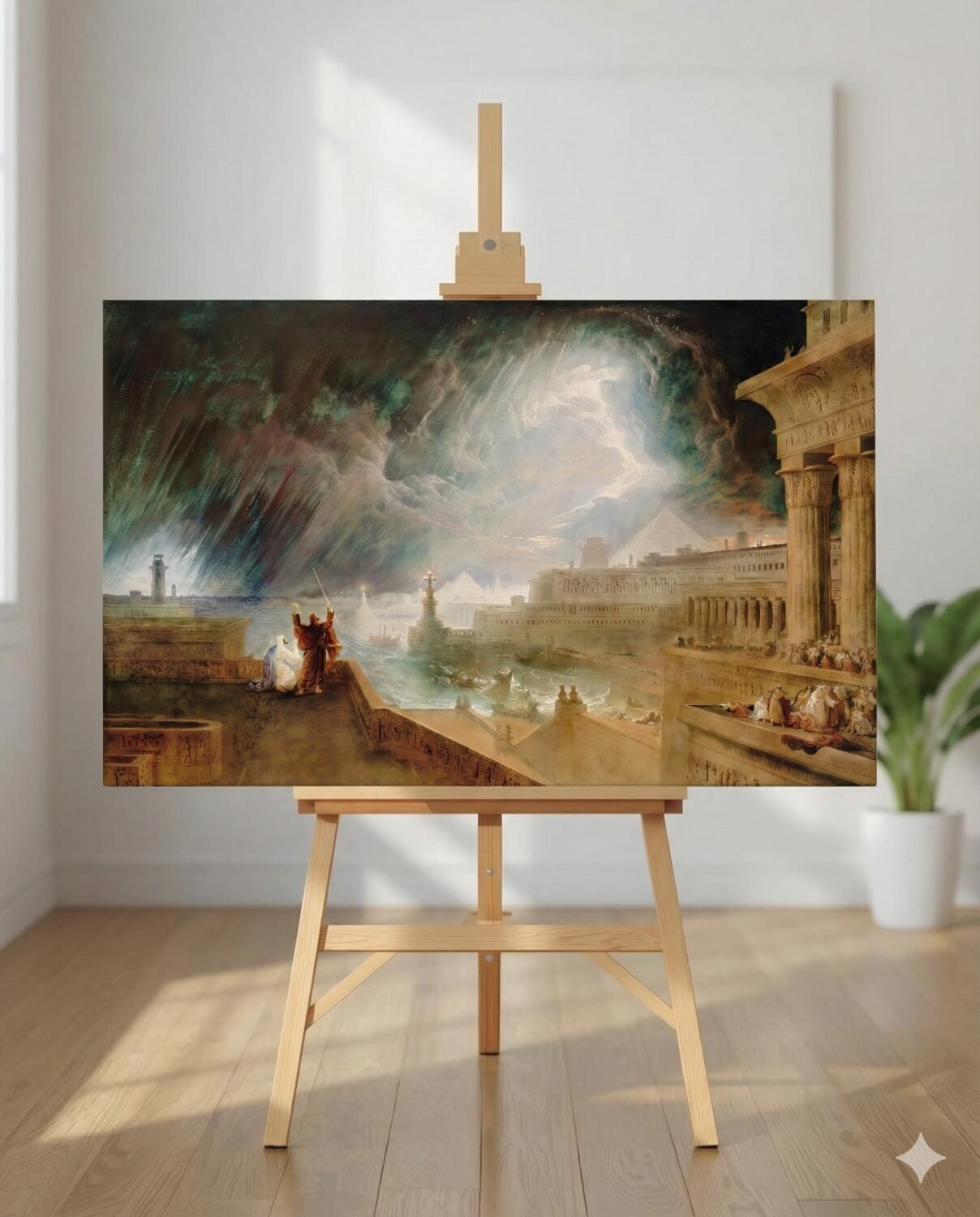 Pintada en pleno siglo XIX, la obra refleja la fascinación romántica por lo sublime y el desastre, pero también dialoga con el clima histórico de la Inglaterra industrial, atravesada por temores morales, religiosos y sociales. John Martin fue célebre por sus visiones bíblicas monumentales, concebidas casi como espectáculos totales, donde la pintura funciona como advertencia y como relato épico. En La séptima plaga de Egipto, el castigo no es solo un episodio bíblico: es una imagen del colapso de todo orden que se cree eterno, una lección visual sobre el límite del poder humano frente a fuerzas que lo exceden.