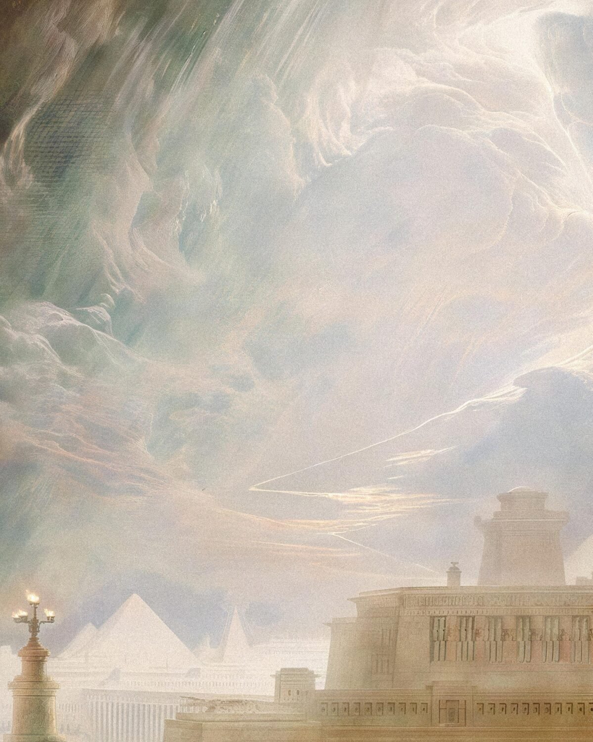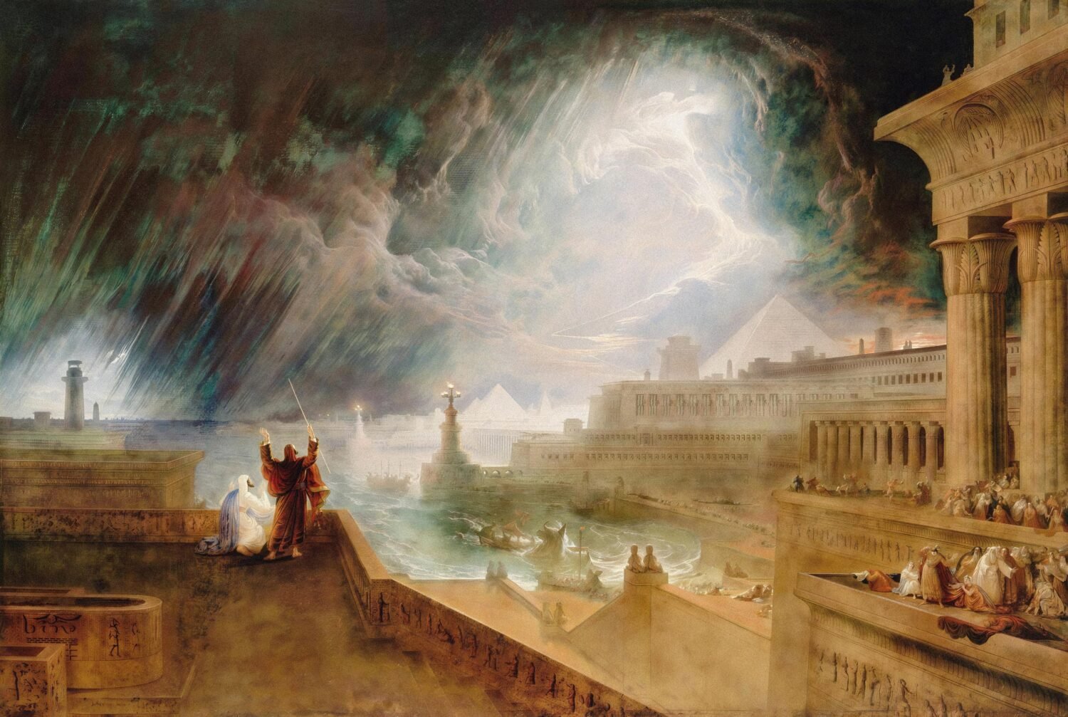 La escena representa el momento bíblico en que Egipto es castigado por una tormenta devastadora de granizo y fuego, enviada tras la negativa del faraón a liberar al pueblo hebreo. Martin construye una visión apocalíptica: columnas de arquitectura colosal se derrumban, la ciudad se quiebra bajo una violencia cósmica y el cielo se convierte en el verdadero protagonista, cargado de nubes negras, relámpagos y una luz sobrenatural que parece juzgarlo todo. Las figuras humanas, diminutas y desesperadas, refuerzan la idea central de la obra: frente al castigo divino, el poder político y la soberbia imperial se revelan frágiles e insignificantes.