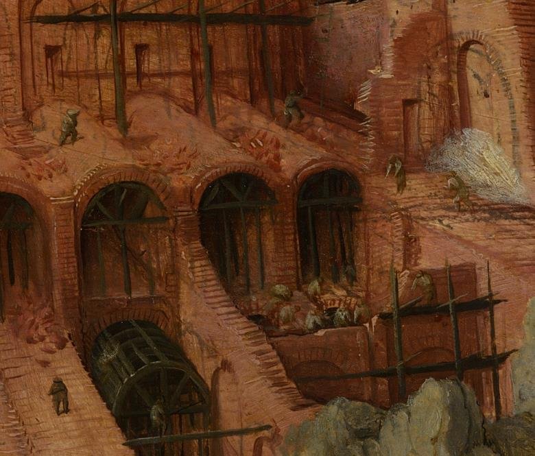 La construcción imposible se eleva en espiral hacia un cielo apenas contenido. No es solo una ilustración del relato bíblico, sino una crítica precisa al orgullo humano, a la obsesión por el poder y al delirio de imponer un orden universal. Brueghel representa la torre como una mezcla de coliseo romano y arquitectura flamenca, anclada en lo reconocible para advertir que el mito es también presente. Las figuras humanas son diminutas, casi irrelevantes frente a la estructura monumental, reforzando la idea de que la obra misma terminará por aplastar a sus creadores. La confusión de lenguas ya ha comenzado: lo que parecía una obra de unidad es ya una ruina en progreso.